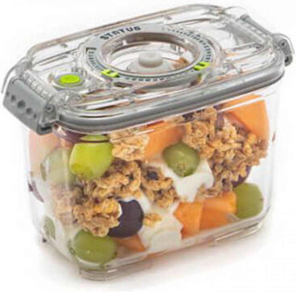 Vakuová nádoba Status Tritan o objemu 0,8 l je vyrobena z prvotřídního plastového Tritanu, který je zcela průhledný a nerozbitný. Umožňuje snadné uchovávání potravin a výrazně prodlužuje jejich životnost. Tritanová nádoba Status má navíc indikátor vakua, s kterým jednoduše poznáte míru odsátí vzduchu. Ukazatelem data v horní části víka pak snadno zaznamenáte datum uskladnění nebo expirace.