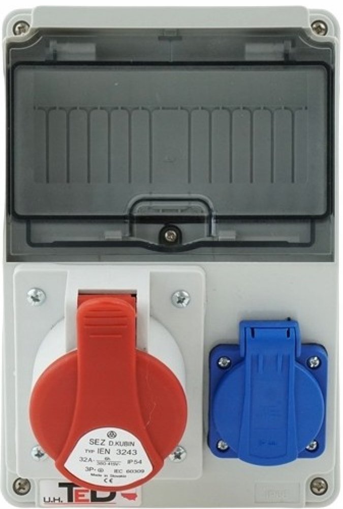 - Typy zásuvek: 400V 32A/4P + 1 x 250V 16A