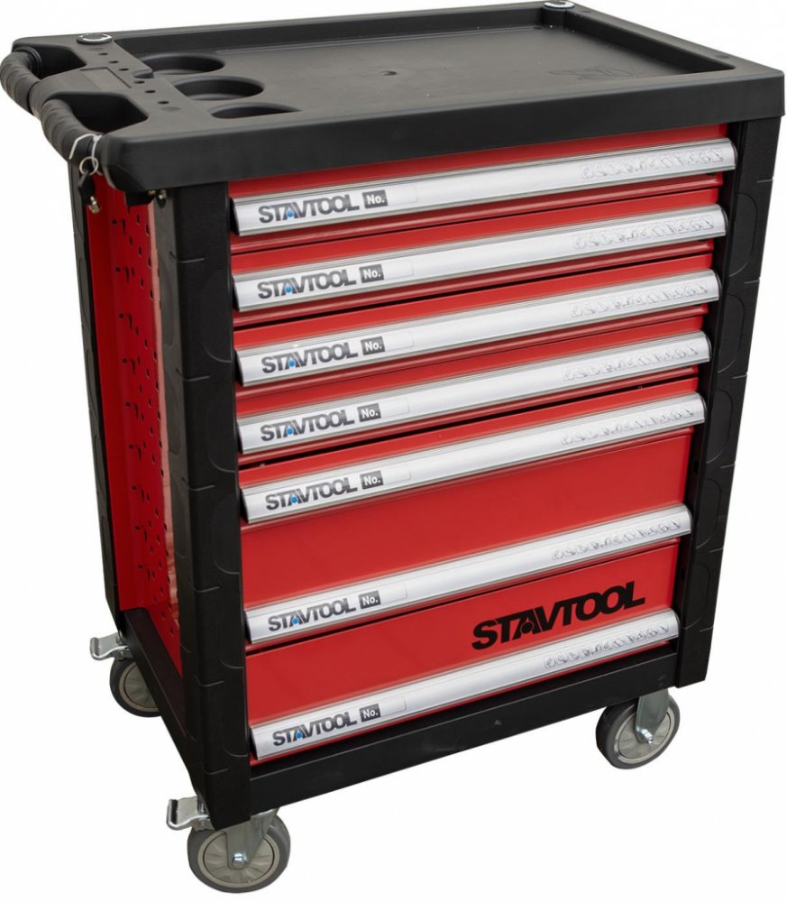 Kovový montážní vozík na nářadí se 7 zásuvkami. Dvě pevná a dvě otočná kola s poziční brzdou. Zásuvky s kuličkovými ložisky lze vysunout do 40 cm. Horní pracovní plocha i zásuvky jsou vypodloženy protiskluzovou podložkou. Držadlo pro manipulaci s vozíkem lze umístit z pravé i levé strany. Součástí je 5 nízkých a 2 vysoké uzamykatelné zásuvky.