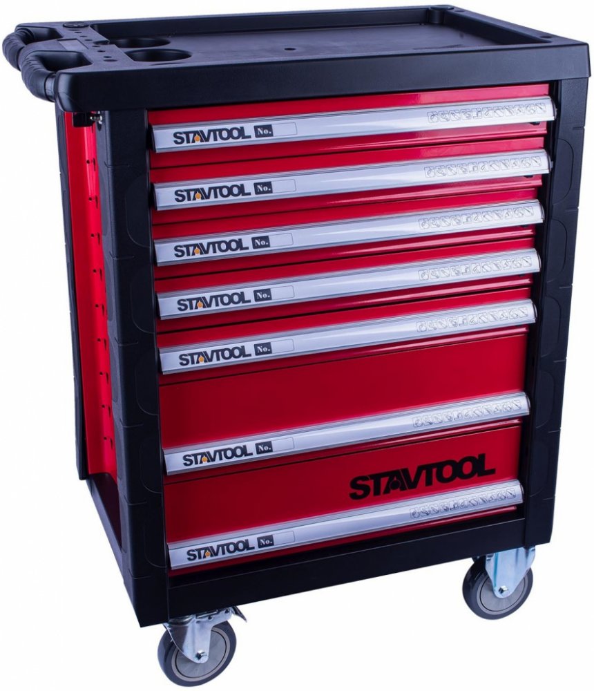 Kovový montážní vozík na nářadí se 7 zásuvkami. Dvě pevná a dvě otočná kolečka s poziční brzdou. Zásuvky na kuličkových ložiskách lze vysunout 40 cm. Horní pracovní plocha i zásuvky jsou vypodloženy protiskluzovou podložkou. Držadlo pro manipulaci s vozíkem lze umístit z pravé nebo levé strany. Uzamykatelné zásuvky. 5 nízkých a 2 vysoké zásuvky. Montážní vozík obsahuje 234 kusů nářadí.