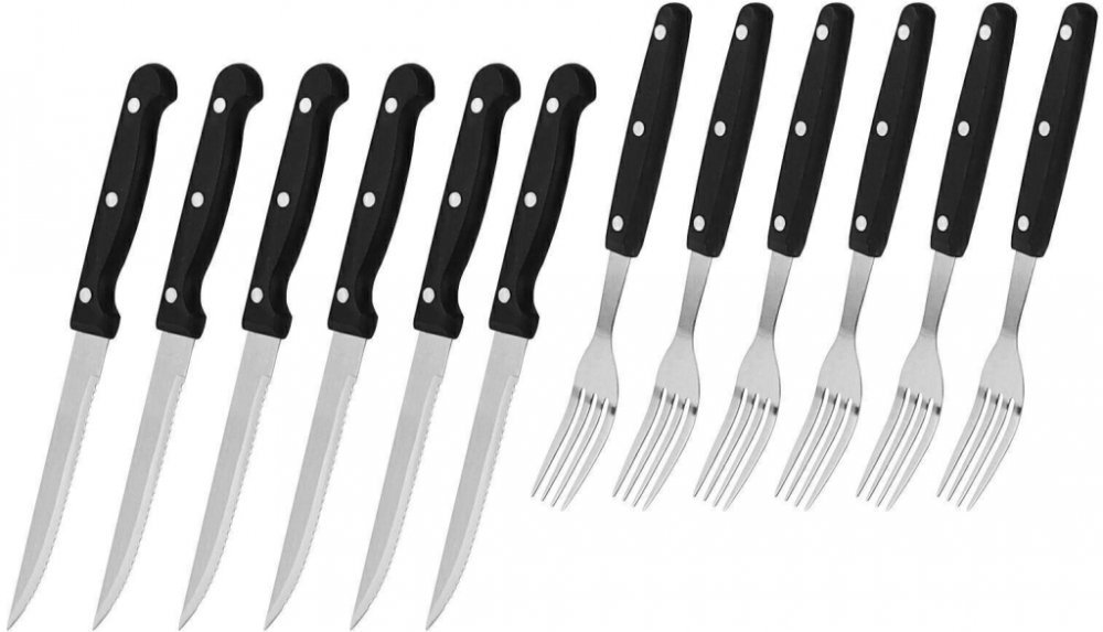Kvalitní 12dílná sada příborů na gril, steak nebo pizzu složená z nožů a vidliček z kvalitní nerezové oceli. Nože se vyznačují stabilní pevnou čepelí, která se neohýbá a ergonomické rukojeti zajišťují pohodlný úchop.