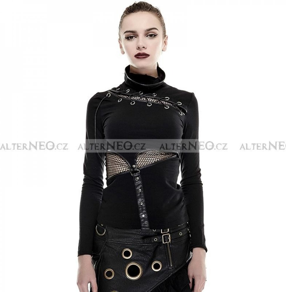 Steampunk /postapo / gothic černé originální triko ke krku s dlouhým rukávem, asymetrickým šněrováním, průhlednými průstřihy a působivými detaily z ekokůže. Rolák je vyroben z působivého materiálu lehce vyšisovaného vzhledu. Lze ho efektně natáhnout přes obličej jako masku a dotáhnout tak temný look k dokonalosti. Tento jedinečný steampunk /postapo / gothic top s dlouhým rukávem je jednoduchý, civilní, příjemně se nosí, zároveň je ale díky svému zpracování a působivým detailům velmi nekonvenční a extravagantní. Přesto můžete v tomto démonickému topu od legendárních Punk Rave vyrazit ven, aniž byste budili dojem, že jste v kostýmu.Tento originální černý top se hodí jako působivý základ pro steampunk, cyber punk, postapo i gothic outfity, je velmi výrazný a sexy, zároveň ale skvěle kombinovatelný a rozhodně ne laciný.