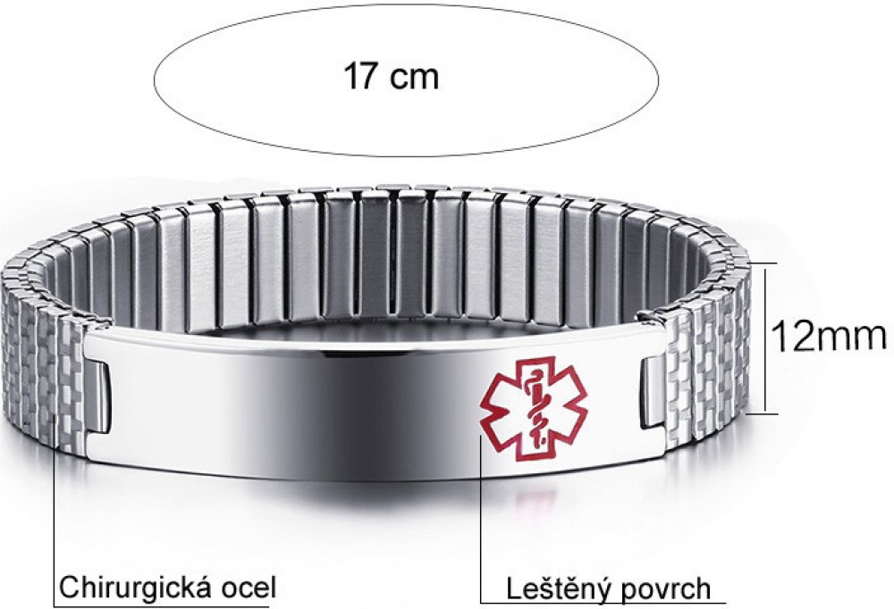 Ocelový pružný náramek s identifikační destičkou. Povrch náramku je leštěný, pružná část se vzorem na identifikační destičce je zdravotnický znak. Náramek je široký 12mm, vnitřní průměr náramku 17, nebo 19,5 cm. Identifikační náramek z chirurgické oceli. Odolnost chirurgické oceli, její stálost a nevyvolávání alergických reakcí jsou vlastnosti, pro které představuje ideální materiál na výrobu nár...