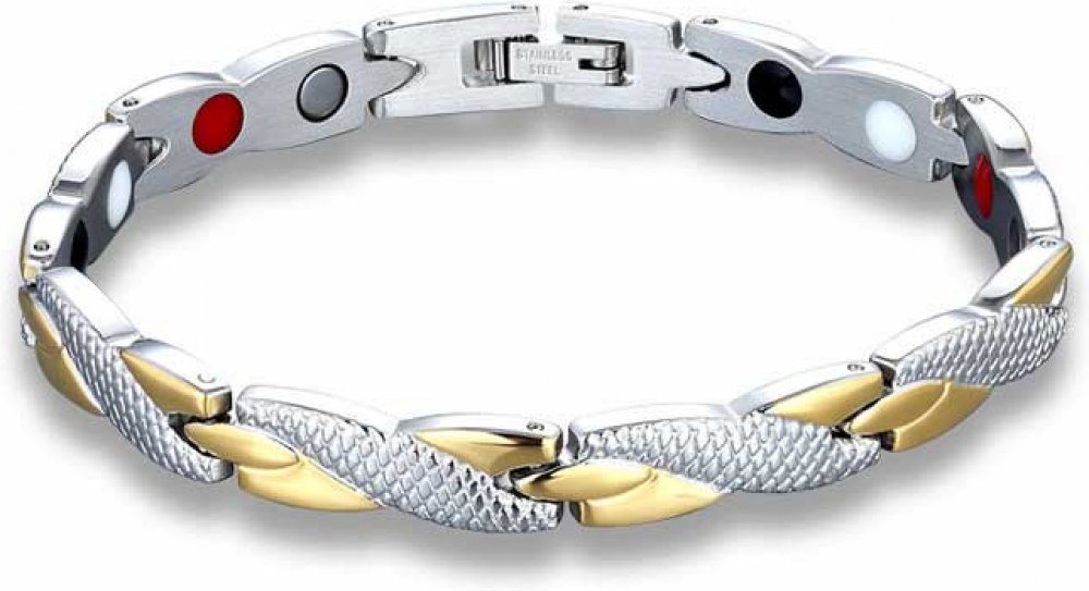 Dámský magnetický náramek z chirurgické oceli. Povrch náramku je částečně pokrytý vzorem a částečně pozlacený technologií PVD. Náramek je široký 7 mm, délka náramku 21 cm. Délku náramku je možné na přání zdarma zkrátit. Magnetický dámský náramek na paži z chirurgické oceli. Jako všechny šperky zhotovené z materiálu chirurgická ocel, je také tento náramek odolný proti poškození, nevyvolává magnetické reakce, neoxiduje, chirurgická ocel nemění barvu. Díky těmto vlastnostem a přijatelné ceně se ocelové šperky těší stále značně vysoké popularitě ve stále se rozšiřujících řadách spokojených uživatelů.