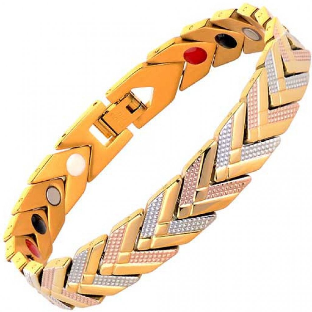 Náramek z chirurgické oceli s magnety. Povrch náramku je pozlacený technologií PVD. Náramek je široký 11 mm, délka náramku 20,5 cm. Délku náramku je možné na přání zdarma zkrátit. Magnetický náramek na paži z chirurgické oceli. Jako všechny šperky zhotovené z materiálu chirurgická ocel, je také tento náramek odolný proti poškození, nevyvolává magnetické reakce, neoxiduje, chirurgická ocel nemění b...