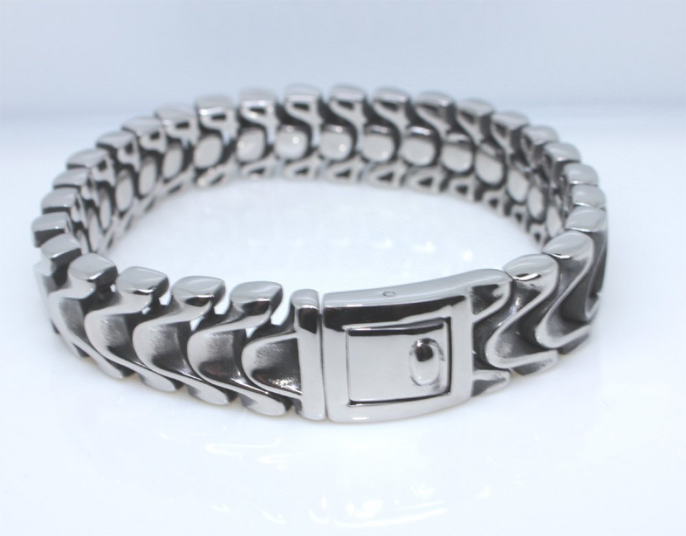 Pánský náramek z chirurgické oceli. Povrch náramku je leštěný v kombinaci s patinou. Šířka náramku 16mm, délka 22cm. Náramky z chirurgické oceli se stále řadí mezi velmi vyhledávané šperky především pro vlastnosti, které chirurgická ocel má. Náramky z chirurgické oceli neoxidují, nemění barvu, jsou odolné proti poškození a nevyvolávají alergické reakce. Zejména pro tyto vlastnosti se náramky z chi...