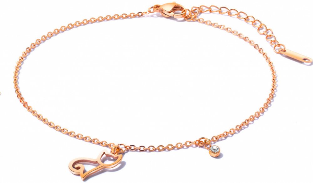 Řetízek na kotník z chirurgické oceli. Povrch řetízku je upravený IP barvou růžového zlata. Délku řetízku lze plynule nastavit v rozmezí 22-26 cm. Zapínání náramku na kotník je karabinové. Řetízek na kotník z chirurgické oceli s povrchem upraveným zlatou IP barvou.