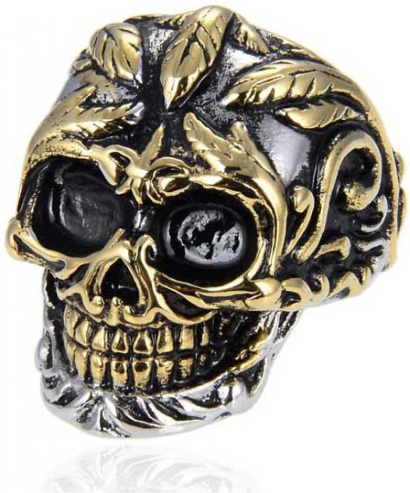 Prsten z chirurgické oceli pro muže lebka. Prsten má povrch kombinující zlacení PVD, patinu a lesk. Obroučka prstenu je v nejužším bodě široká 6,5mm a plynule se rozšiřuje na 15mm. Lebka má rozměr 22x30mm.