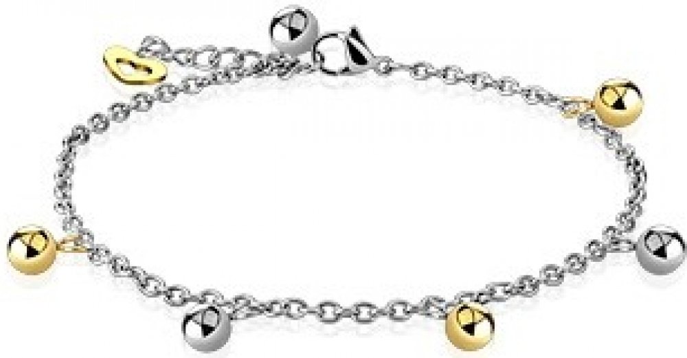 karabinové zapínání. Délku lze nastavit v rozmezí 22–25cm. Náramek na kotník z chirurgické oceli s přívěsky. Všechny ocelové