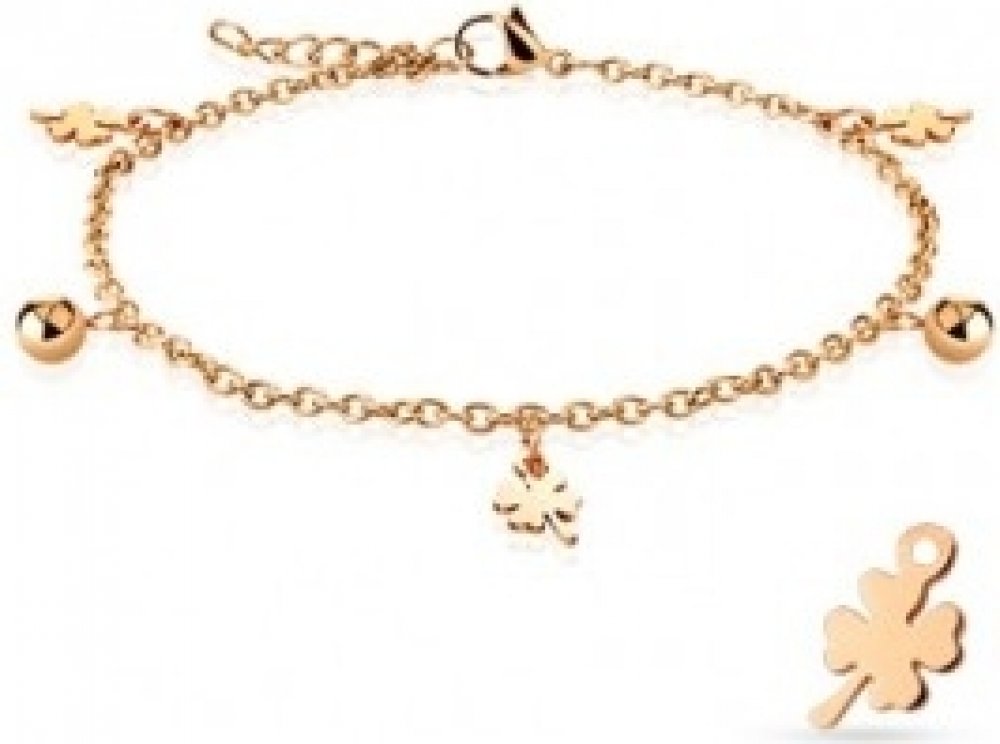 Řetízek na nohu z chirurgické oceli zdobený přívěšky. Oválná očka mají rozměr 3,5×2,5mm. Kuličky mají průměr 6mm, rozměr čtyřlísků 8×6mm. Náramek na kotník má karabinové zapínání. Délku lze nastavit v rozmezí 22–25cm. Náramek na kotník z chirurgické oceli s přívěsky. Všechny ocelové šperky jsou odolné proti poškození, neoxydují a nevyvolávají alergické reakce.