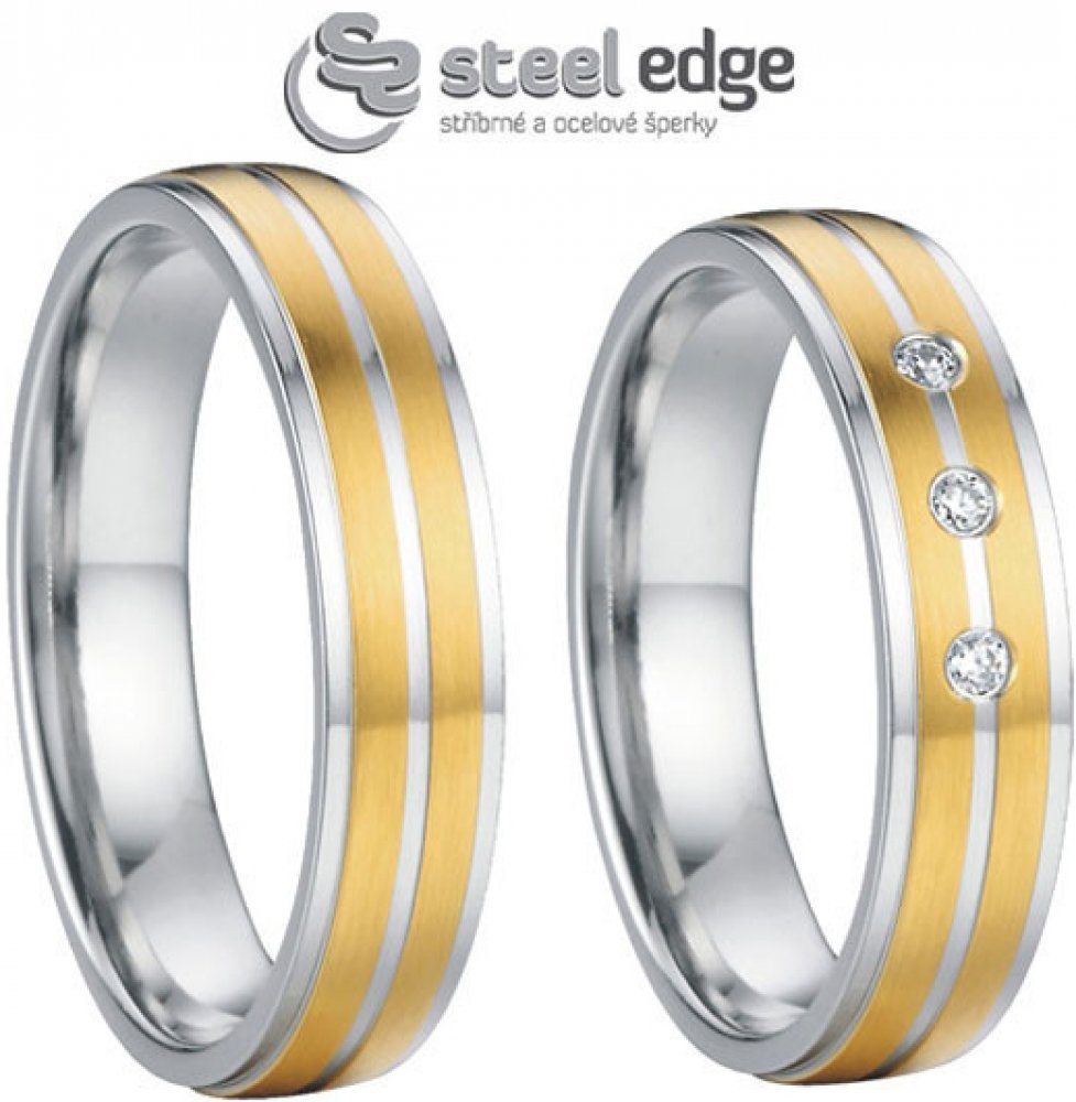 Snubní prsteny z chirurgické oceli. Pozlacené proužky jsou matné stříbrné drážky jsou leštěné. Dámské prstýnky ve velikostech 49-57 jsou osazené zirkony. Pánské prsteny ve velikostech 59-70 jsou bez zirkonu. Svatební prsteny široké 6 mm. Výše uvedená cena je za jeden snubní prsten. Dámský snubní prsten se zirkony je za jinou cenu nežli pánský snubní prsten bez zirkonů. Krásné snubní prsteny na je...