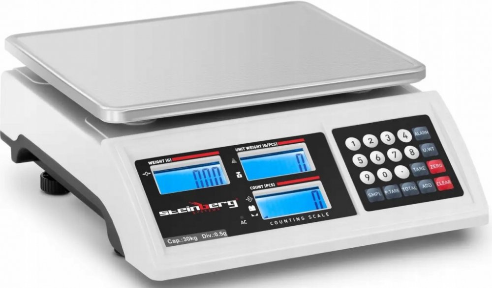 Přehledné a přesné vážení s váhou se třemi LCD displeji Počítací váha slouží k určení počtu kusů na základě hmotnosti – ať už se jedná o šrouby, bonbóny nebo jiné kusové zboží, se kterým denně obchodujete nebo pracujete. Vzhledem k vysoké přesnosti měření lze i určovat i opravdu velká množství malého zboží – například v průmyslové výrobě nebo při inventurách. přesná – díky rozsahu měření od 2 g do 30 kg lze určovat i opravdu malá množství s přesností 0,5 g připojitelná – snadné připojení k počítači přes rozhraní RS232 přehledná – 3 LCD displeje s podsvícením a velkými číslicemi robustní – stabilní pouzdro z ABS plastu a vážicí plocha z ušlechtilé oceli se snadnou údržbou vyvážená – integrovaná vodováha a výškově nastavitelné nožičky zajišťují optimální vyvážení váhy