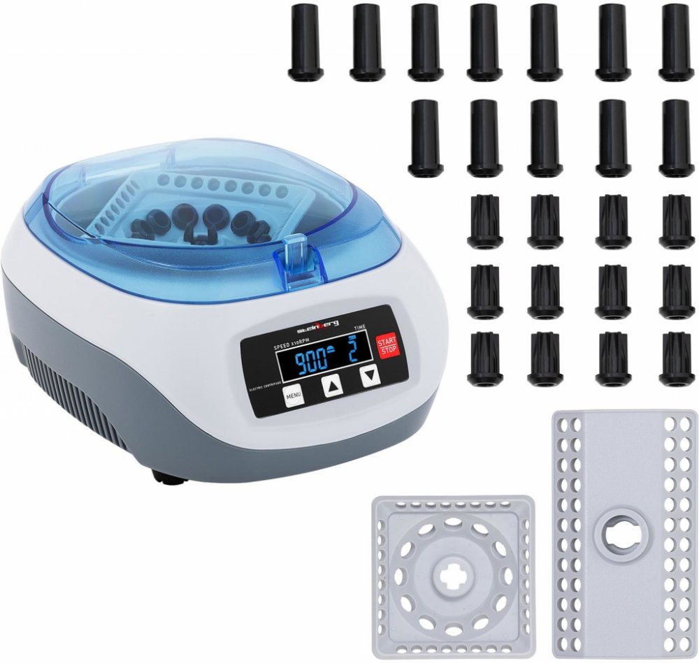 Stolní centrifuga SBS-LZ-300D značky Steinberg Systems je dobrým doplňkem vašich laboratorních potřeb. Elektrická centrifuga představuje vědecký pomocný přístroj, který nachází uplatnění v průmyslových laboratořích, výzkumných střediscích a vzdělávacích institucích, jako jsou školy nebo univerzity. Elektrický pohon této kompaktní laboratorní centrifugy má výkon 45 W. Pomocí dvou úhlových rotorů může pohon účinného motoru zpracovávat současně 12 zkumavek po 1,5/2 ml nebo 48 PCR proužků či 48 zkumavek po 0,2 ml. Pomocí adaptérů může první rotor centrifugy uchytit i malé zkumavky o objemu 0,2 a 0,5 ml. Otáčky lze pomocí mikroprocesoru regulovat mezi 500 a 12 000 ot/min a generuje se zde relativní maximální odstředivé zrychlení 5 960 xg. Díky tomu je tato laboratorní odstředivka velmi flexibilní a umožňuje zvolit nejlepší rychlost otáčení pro každý konkrétní vzorek: nastavitelnými otáčkami se generuje vhodná odstředivá síla a pevné částečky se oddělí od kapaliny, kterou lze poté snadno slít. Zařízení pracuje maximálně rovnoměrně a tiše. Díky lehké a kompaktní konstrukci lze elektrickou stolní odstředivku bez problémů přepravovat a navíc šetří místo v těsných pracovních prostorách vaší laboratoře. Zařízení disponuje časovačem, který lze nastavit od 0 do 99 minut. Díky němu ušetříte zbytečný čas při čekání, protože sami určíte, kdy má odstřeďování automaticky skončit. Přesných výsledků se zde dosahuje nastavením času. Všechny hodnoty jsou zřetelně zobrazeny na LCD displeji a lze je nastavit pomocí přehledného ovládacího panelu.