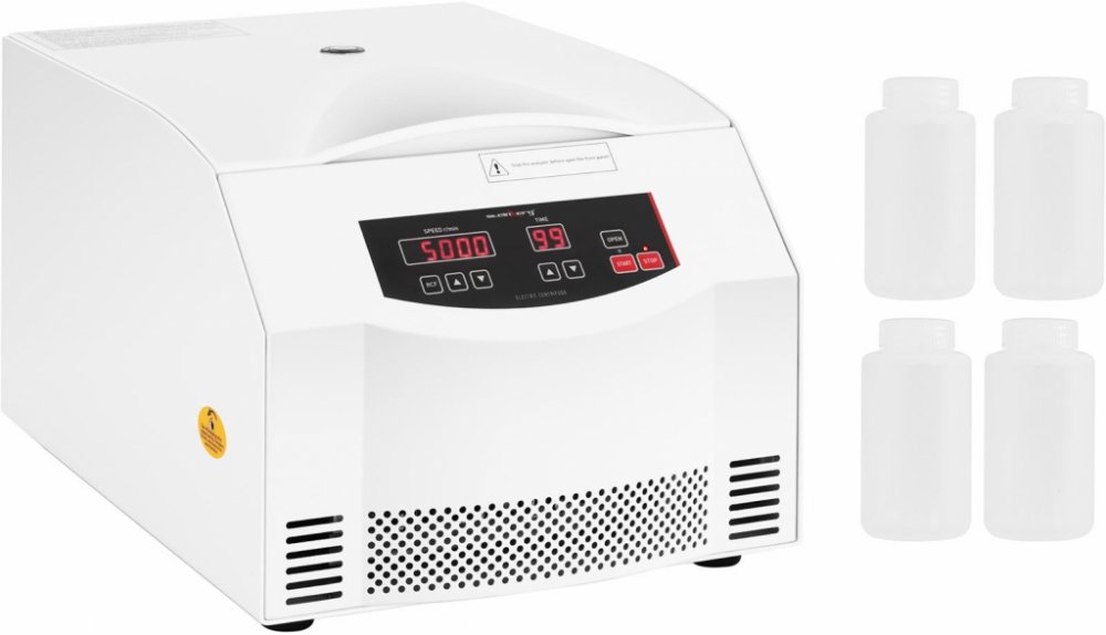 Stolní centrifuga SBS-LZ-5000LS značky Steinberg je dobrým doplňkem vašich laboratorních potřeb. Elektrická centrifuga představuje vědecký pomocný přístroj, který nachází uplatnění v průmyslových laboratořích, výzkumných střediscích a vzdělávacích institucích, jako jsou školy nebo univerzity. Elektrický pohon kompaktní centrifugy má výkon 500 W. Pomocí bezúdržbového motoru dokáže pohon zpracovávat čtyři zkumavky o objemu à 250 ml současně. Otáčky lze regulovat mezi 300 a 4 000 ot/min pomocí mikroprocesoru a při svém maximu vytvářejí relativní maximální centrifugační sílu 4730 xg. Díky tomu je laboratorní centrifuga velmi adaptabilní a umožňuje zvolit nejlepší rychlost otáčení pro konkrétní vzorek: Regulovatelná rychlost vytváří vhodnou odstředivou sílu a pevné částice se odlučují od kapaliny, kterou lze poté snadno dekantovat. Deset přednastavených rychlostí usnadňují provoz a kryt s funkcí alarmu chrání vzorky před kontaminací – vyjma spuštění alarmu pracuje elektrická odstředivka tiše a hladce. Díky lehké a kompaktní konstrukci lze elektrickou stolní odstředivku bez problémů přepravovat a navíc šetří místo v těsných pracovních prostorách vaší laboratoře. Zařízení disponuje časovačem, který lze nastavit od 0 do 99 minut. Díky němu ušetříte zbytečný čas čekáním, protože sami určíte, kdy má odstřeďování automaticky skončit. Pro časy odstřeďování nad 99 minut disponuje přístroj trvalým režimem. Všechny hodnoty jsou zřetelně zobrazeny na digitálním displeji a lze je nastavit pomocí ovládacího panelu, který můžete dezinfikovat.