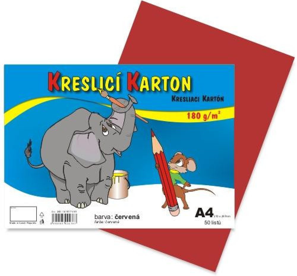 Kreslicí karton barevný - červený, formát A4 (210 x 297 mm), 50 listů v balení, plošná hmotnost 180 g/m2. Najde uplatnění nejen ve školách, školkách, družinách ale i u výtvarníků a aranžérů.