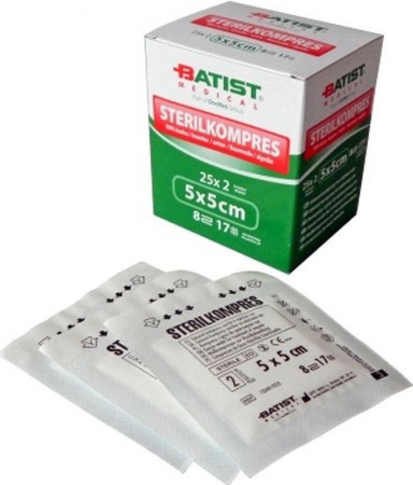 \nKlasický sterilní gázový kompres je vyroben ze 100% bělené bavlny a tkaný s hustotou 17 vláken/cm2. Gáza je dále skládána v osmi vrstvách do formy kompresů. Předností je dobrá savost, prodyšnost, měkkost a hebkost. Díky založeným okrajům se mohou použít i při vícenásobném rozložení bez ...