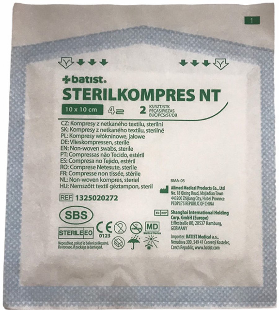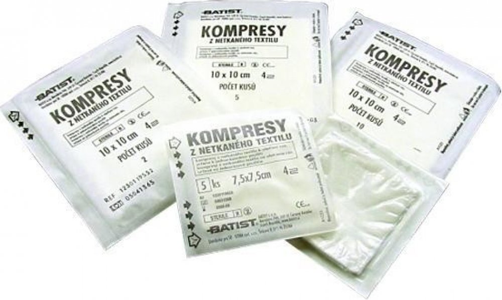 Komprese sterilní. Vlastnosti výrobku: Komprese sterilní je vyrobena z netkané textilie, ve složení 70% viskózy a 30% polyesteru o plošné hmotnosti 30 g/m2. Tkanina je skládána do formy kompresů. Vyznačuje se mnohem lepší vzlínavostí tekutin než klasická gáza. Umožňuje jednodušší manipulaci při stříhání krytí. Nedochází k lepivosti okrajů nebo uvolňování nitek do ran. Předností je velmi dobrá savost, prodyšnost, měkkost a hebkost. Komprese má 4 vrstvy.Použití výrobku: Používá se k všestrannému ošetření ran, zejména při prvním ošetření znečištěných, infikovaných a silně secernujících ran; ve formě tamponu při malých operačních zákrocích v ambulancích a nemocnicích.Rozměry: 10 cm x 10 cmBaleno: 2 ks v balení min. 100 bal.