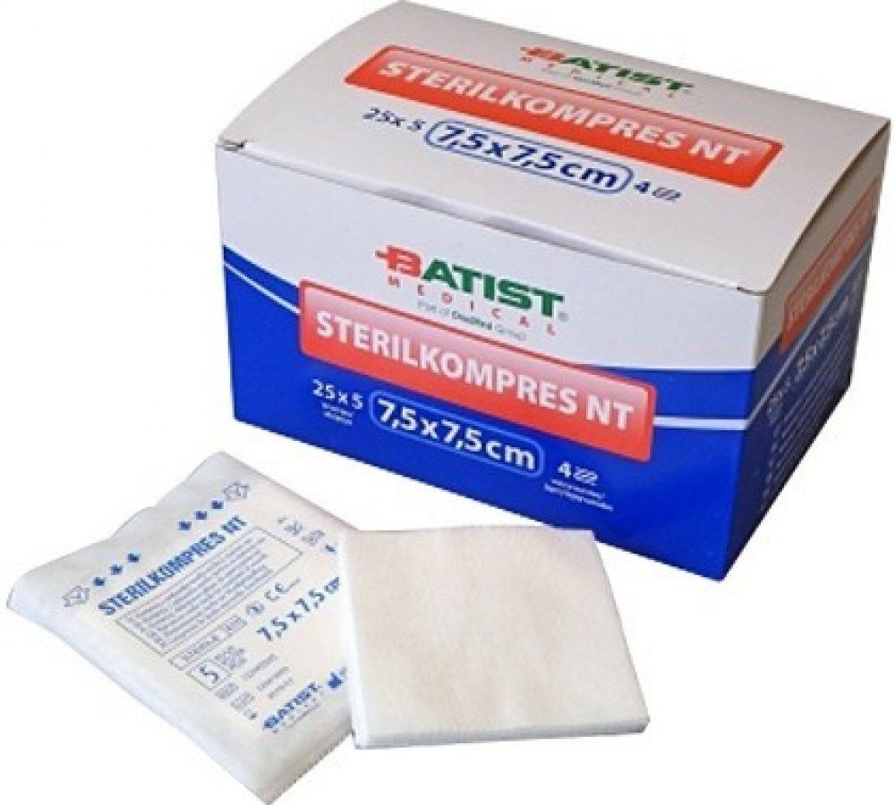 Komprese sterilní. Vlastnosti výrobku: Komprese sterilní je vyrobena z netkané textilie, ve složení 70% viskózy a 30% polyesteru o plošné hmotnosti 30 g/m2. Tkanina je skládána do formy kompresů. Vyznačuje se mnohem lepší vzlínavostí tekutin než klasická gáza. Umožňuje jednodušší manipulaci při stříhání krytí. Nedochází k lepivosti okrajů nebo uvolňování nitek do ran. Předností je velmi dobrá savost, prodyšnost, měkkost a hebkost. Komprese má 4 vrstvy.Použití výrobku: Používá se k všestrannému ošetření ran, zejména při prvním ošetření znečištěných, infikovaných a silně secernujících ran; ve formě tamponu při malých operačních zákrocích v ambulancích a nemocnicích.Rozměry: 7,5 cm x 7,5 cmBaleno: 2 ks v balení min. 100 bal.