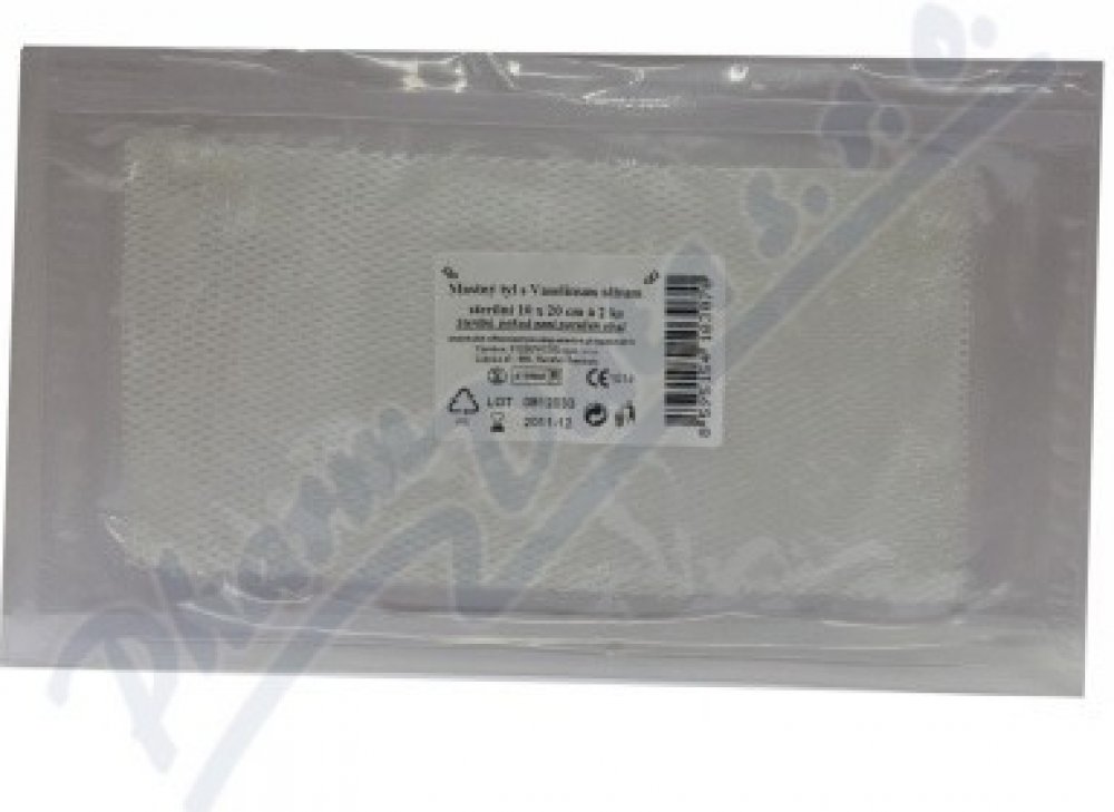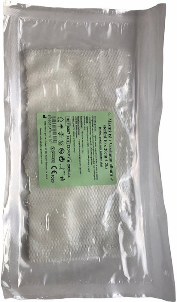 Sterilní mastný tyl je vyroben z obvazové textilie S20 - vysoce porézní hydrofobní obvaz z chemických vláken, určený pro impregnaci léčiv v tekutém nebo masťovém základu. Vaselinum album je farmaceutická pomocná látka, bílá průsvitná roztíratelná hmota, která po roztavení slabě fluoreskuje v denním světle, prakticky bez pachu, neobsahuje aktivní látky. Je vhodný zvláště v dermatologii u pacientů s kožní a lékovou přecitlivostí, v chirurgické praxi k ošetření povrchových popálenin. Balení je provedeno formou fólie, 2 ks, rozměry 10 cm x 20 cm. Sterilizace výrobků je provedena gama zářením. Expirace 3 roky. Výrobek je certifikován CE značkou.