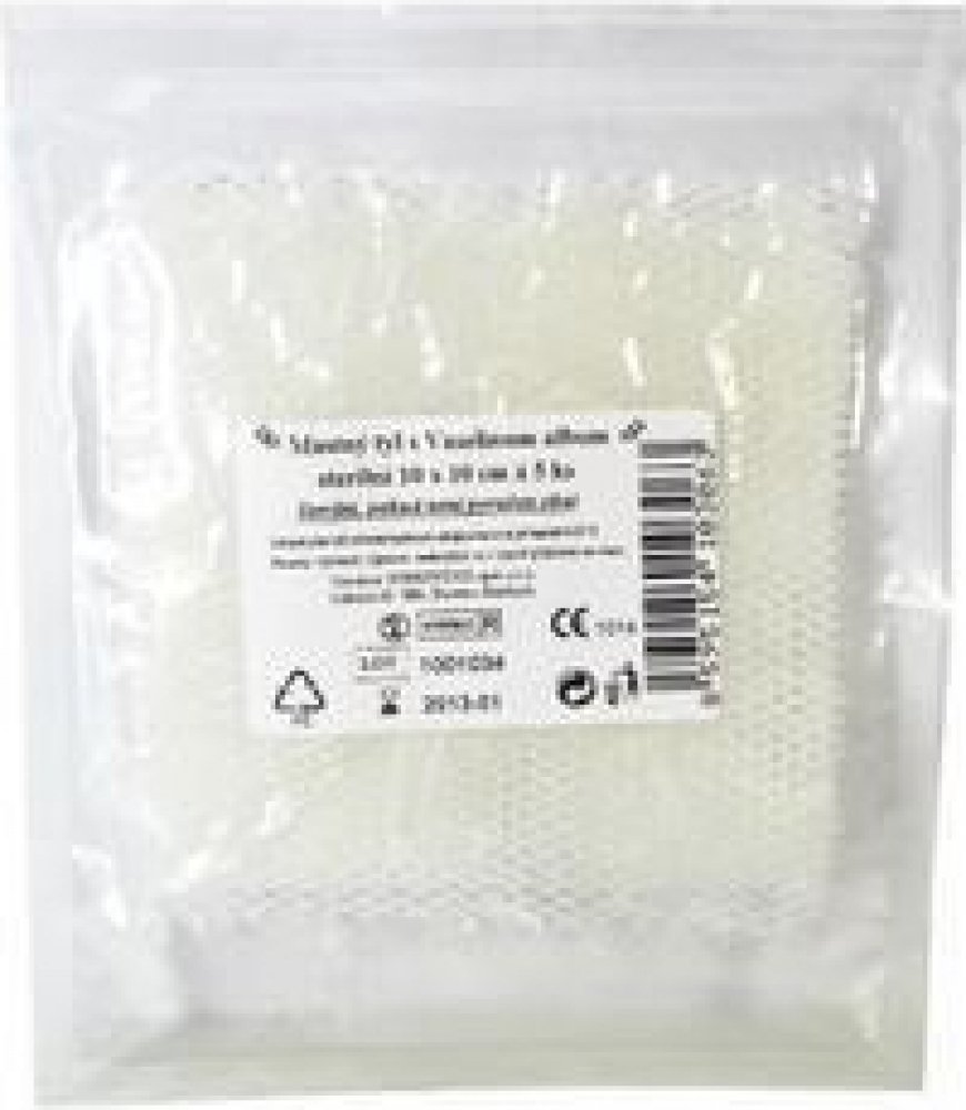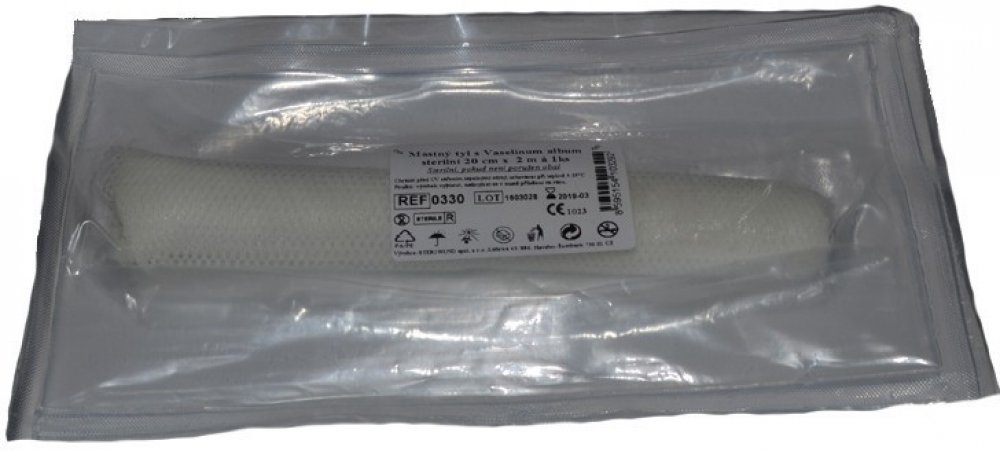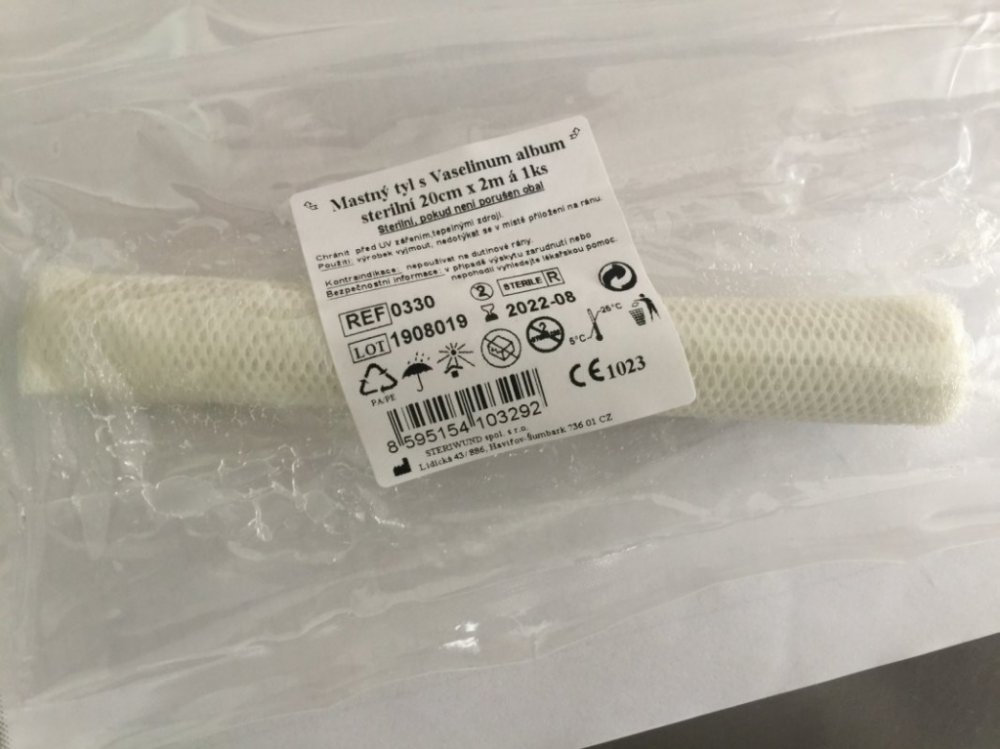 Mastný tyl sterilní. Sterilní mastný tyl je vyroben z obvazové textilie S20 - vysoce porézní hydrofobní obvaz z chemických vláken, určený pro impregnaci léčiv v tekutém nebo masťovém základu. Vaselinum album je farmaceutická pomocná látka, bílá průsvitná roztíratelná hmota, která po roztavení slabě fluoreskuje v denním světle, prakticky bez pachu, neobsahuje aktivní látky.