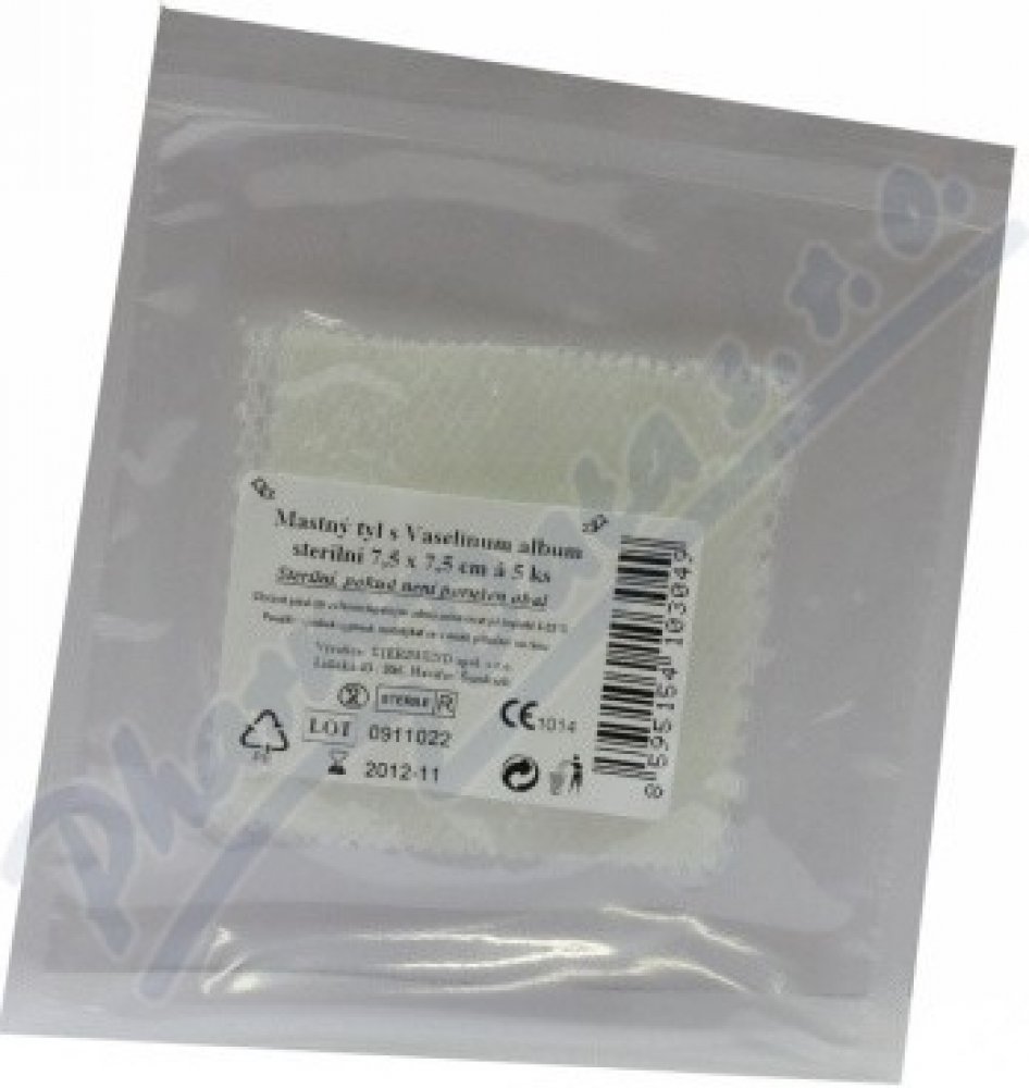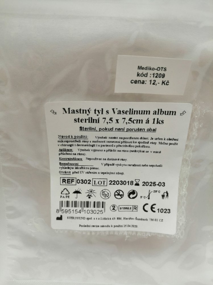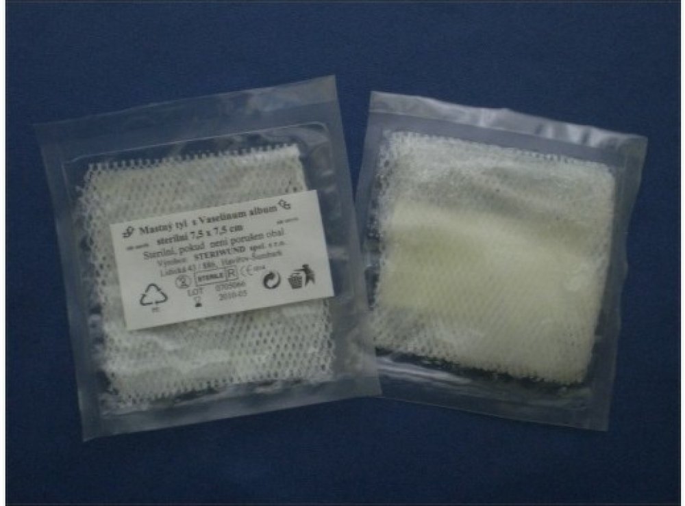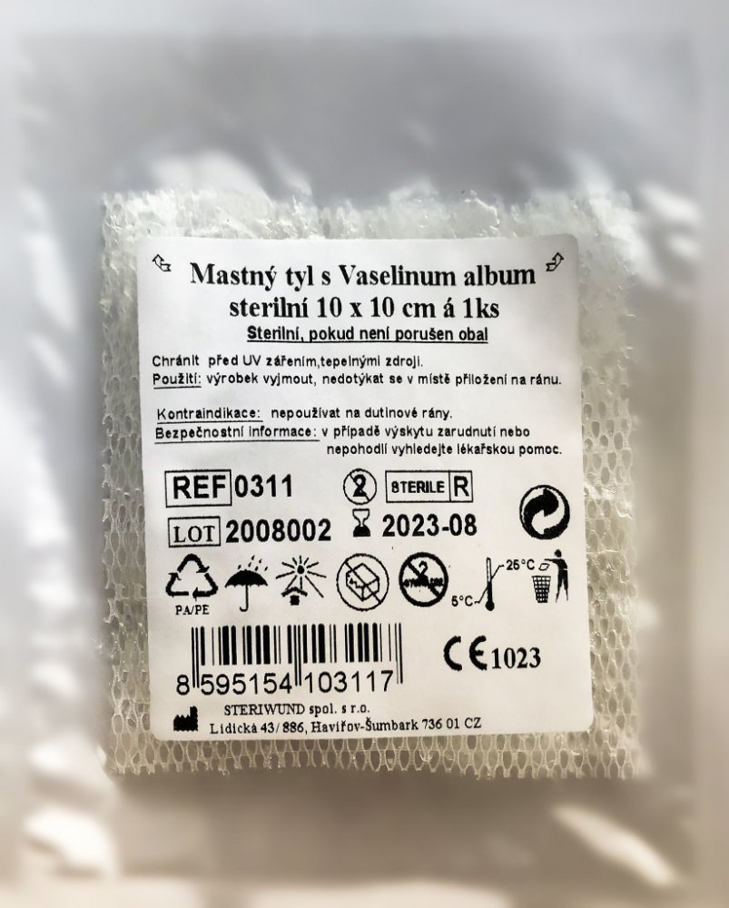 Steriwund sterilní mastný tyl s Vasilinum album je vyroben z obvazové textilie S20 - vysoce porézní hydrofobní obvaz z chemických vláken, určený pro impregnaci léčiv v tekutém nebo masťovém základu.
