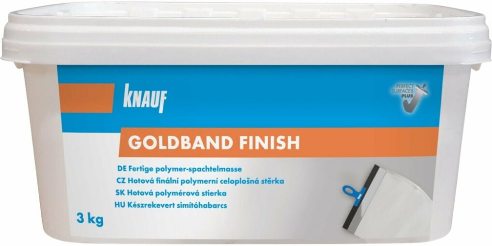 Knauf Goldband Finish je hotová pastovitá stěrka na bázi polymerního pojiva. Použití Pro tenkovrstvé a celoplošné stěrkování vyzrálých minerálních stavebních podkladů, např. sádrokartonových desek. Pro vytvoření finální povrchové úpravy sádrokartonových povrchů pro stupeň kvality Q2/Q3/Q4. Vlastnosti Průmyslově připravená finální hmota k okamžitému použití Ssnadno aplikovatelná a brousitelná Dobrá přídržnost k podkladu Flexibilní a odolná ke vzniku trhlin Dlouhý čas pro zpracování Pro finální vyhlazení povrchů stěn a stropů v interiéru Balení V 3kg plastové nádobě