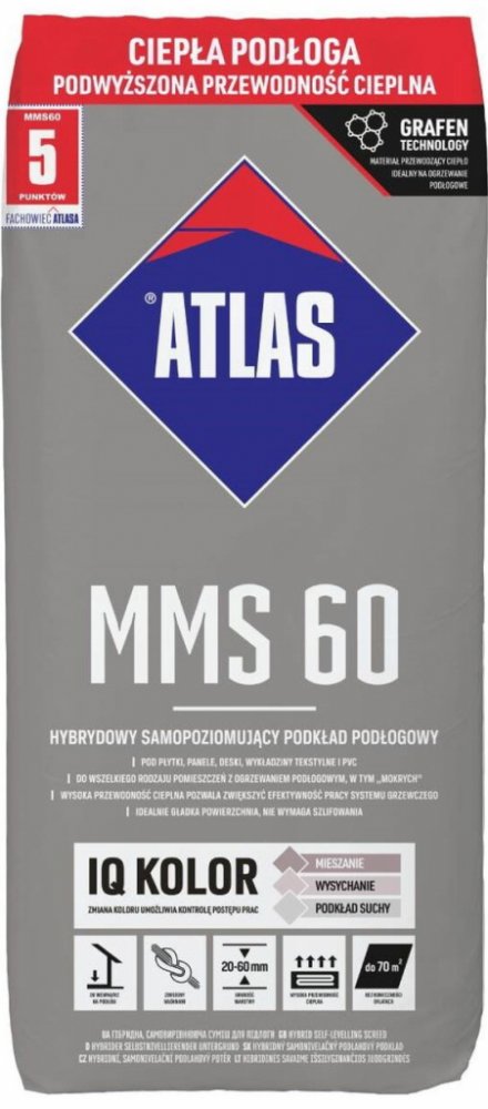 ATLAS MMS 60 je hybridní potěr, který se vyrábí na bázi směsi minerálních pojiv, aktivovaných ve fázi vazby speciálními chemickými přísadami.PoužitíJe ideálním materiálem pro zhotovení všech typů podlahových podkladů, včetně podkladů s vodním podlahovým vytápěním, kapilárních rohoží, elektrických rohoží nebo infračervených topných fólií.Je také určen pro vyrovnávání stávajících potěrů, v rozsahu 20-60 mm.Lze jej použít v suchých i vlhkých místnostech.VlastnostiMá velmi dobrou tepelnou vodivost, lepší než výrobky na bázi cementu.Rychle se zahřívá po spuštění topného systému.Obsahuje indikátor, který umožňuje měnit barvu potěru během jeho schnutí.Díky tomu je mnohem jednodušší posoudit úroveň strukturální vlhkosti hmoty a odhadnout, kdy je možné začít další práce.Výhodyvysoká tepelná vodivostdokonale hladký povrchrychlé zasycháníruční nebo strojní aplikaceTechnické parametrypevnost v tlaku: ≥ 20 N/mm²pevnost v ohybu: ≥ 4 N/mm²min. / max. tloušťka potěru: 20 mm / 60 mm pochůznost: po 8 hodináchbalení: 25 kg