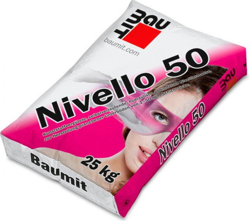 Baumit Nivello 50 cementem pojená zušlechtěná samonivelační stěrka (EN 13 813, CT-C30-F6) k vyrovnání cementových potěrů před pokládáním dlažby a nášlapných podlahových vrstev v interiéru. Vhodná též pro podlahová vytápění. Možnost použití v exteriéru i na dřevěném podkladu viz technický list výrobku.PoužitíPro plošné vyrovnání nerovností podlahových konstrukcích v tloušťce od 3 do 50 mmUrčená na cementové potěry, betonové desky, dřevěné podlahy a původní dlažby v interiéru a exteriéruJe vhodná pro vyrovnání povrchů cementových potěrů s podlahovým vytápěním a k zabudování elektrického podlahového vytápěníNení určena pro přímé použití v komerčně využívaných plocháchVlastnostiSamonivelační, snadno zpracovatelná, vysoce zušlechtěná, s optimální tekutostí, mrazu odolná, se sníženým obsahem emisních látek.VýhodySnadno zpracovatelnáSamonivelační schopnostSnížený obsah emisíTechnické parametryPro tloušťky: 3–50 mmTřída reakce na oheň: A1Pevnost v tahu za ohybu: > 1,5 N/mm² na betonuSpotřeba: cca 1,6 kg/m²/mmVydatnost: cca 15,6 m²/pytel při tloušťce 1 mmPochůznost: cca po 3 hod při teplotě +20 °C a rel. vlhkosti vzduchu do 70 %Spotřeba vody: cca 0,21 l/ (= 5,25 l/ 25 kg pytel)Doba zpracovatelnosti: max. 30 - 35 min.Balení: 25 kg