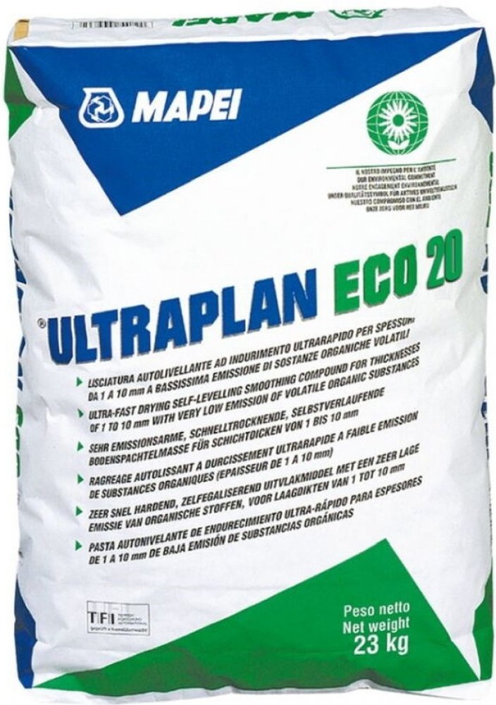 Mapei Ultraplan Eco 20 je rychlehydratující a rychlevysychající samonivelační hmota pro použití v interiéru. Použití K vyrovnávání podlah v interiéru před pokládkou krytin, vhodný zvláště pro prostory s pojezdem kolečkových židlí nebo vozíků. Vlastnosti zpracovatelnost: 20-30 minut tloušťka pro aplikaci: od 1 do 15 mm pochůznost po cca 3-4 hodinách technologická přestávka před pokládkou: 24-48 hodin barva: šedá aplikace: stěrkou, hladítkem nebo strojně skladování: 12 měsíců spotřeba: 1,6 kg/m² a mm tloušťky vrstvy Výhody rychlá příprava velmi nízké emise Balení v 23kg pytlech