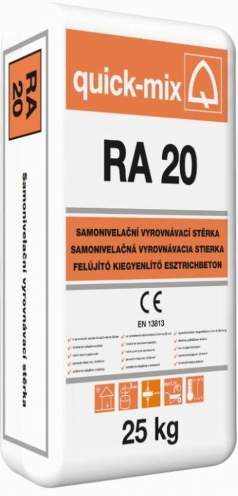 Quick-mix RA 20 je samonivelační cementová vyrovnávací stěrka tř. CT C25 F4. Použití Jde o lehce zpracovatelnou samonivelační stěrku pro aplikaci na podlahy v tloušťkách vrstev od 2 do 20 mm. Vhodná je také na vytápěné podlahy. Stěrka je použitelná pouze ve vnitřním prostředí. Vlastnosti flexibilní hmota vytvrzující bez vzniku pnutí v exteriéru pouze pod střešní konstrukcí bez přístupu vody, zrnitost 0–0,6 mm, vydatnost 15,5 l/25 kg, spotřeba cca 1,6 kg/m2/mm tloušťky vrstvy. Výhody doba zpracování do cca 45 minut, zvýšená pevnost v tlaku min. 25 N/mm2 Balení v 25kg pytlech, 48 ks/paleta: 1200 kg.