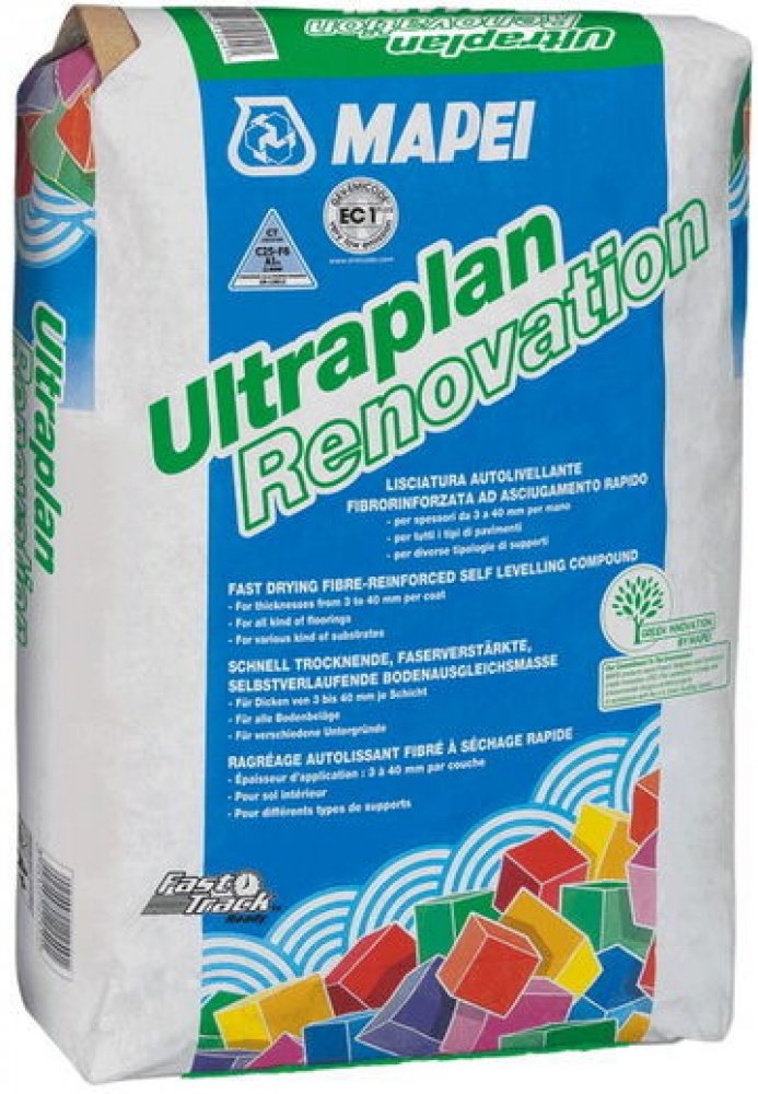 Ultraplan Renovation je samonivelační vlákny vyztužená rychletvrdnoucí vyrovnávací hmota pro tloušťky vrstvy od 3 do 40 mm.PoužitíV interiérech na vyrovnání a vyhlazení rozdílných tlouštěk od 3 do 40 mm na nových nebo stávajících podkladechDoporučuje se zejména pro vyrovnávání problematických podkladů jako jsou například dřevěné podlahy různých typů, a pro podklady, které nejsou z hlediska fyzikálních a chemických parametrů stejné, zejména v případě rekonstrukčních prací v budovách, kde se provádějí demolice a dispoziční změnyJe ideální pro vyhlazování a vyrovnávání povrchů, především v případě potřeby eliminovat rozdíly v úrovních podkladů před pokládkou: všech typů a formátů obkladů a dlažeb z keramiky a přírodního kamene, laminovaných a vinylových dílců, vícevrstvých dřevěných podlah a textilních krytinVlastnostiSnadná zpracovatelnostVelmi dobrý rozlivVysoká výtěžnostMožnost přípravy a dopravy čerpadlemVytvrzuje bez smršťováníVýhodyVynikající přídržnost k podkladukrátká doba tuhnutíDobré vyrovnání povrchuTechnické parametryPochůznost: po 4-5 hodináchSpotřeba: 1,6 kg/m² na 1 mm tloušťky vrstvyBalení: 23 kg pytel