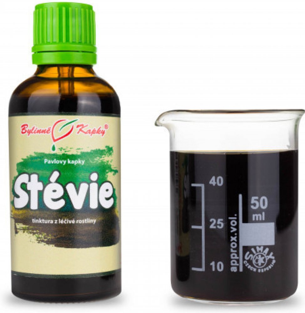 Stévie (bylinná tinktura - Pavlovy bylinné kapky). Přírodní bylinný celkový (komplexní) extrakt z listů léčivé rostliny stévie sladké. Stévie sladká (Stevia rebaudiana). Tinctura Steviae folium. Tincture Stevia leaf. Jedna 50 ml lahvička obsahuje přibližně 1000 kapek a vystačí na 16 - 20 dnů.U akutních potíží se dostavují výsledky většinou v řádu několika hodin až dnů, stačí tedy jedno 50 ml balen...