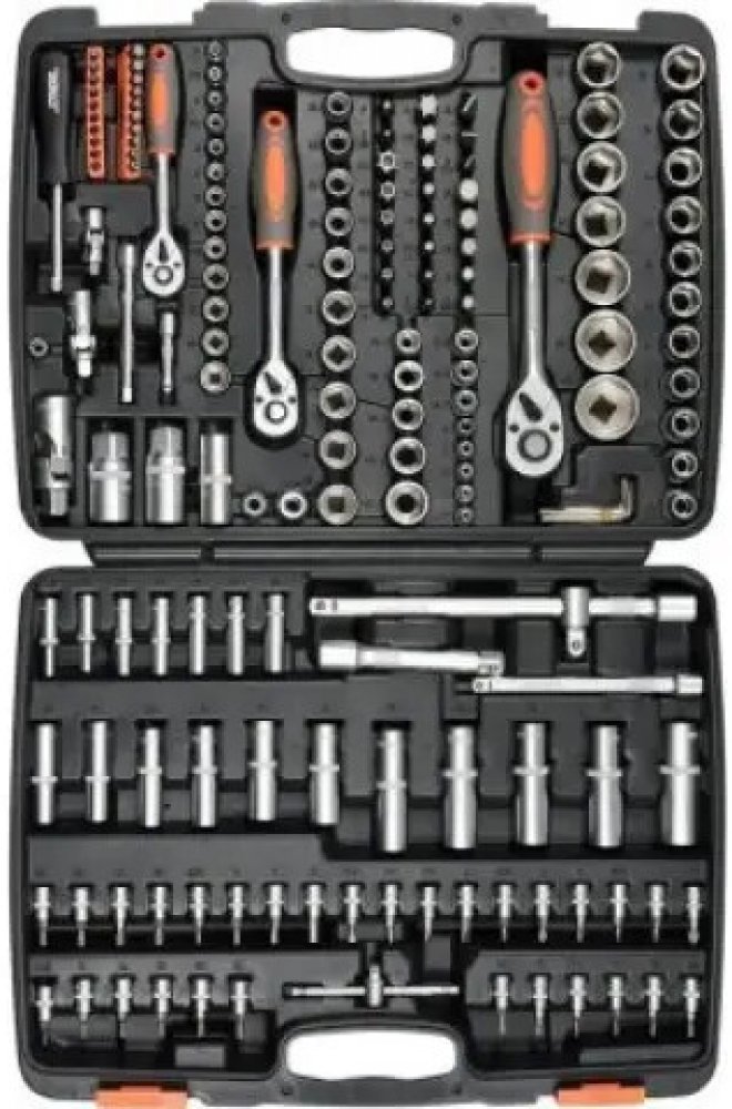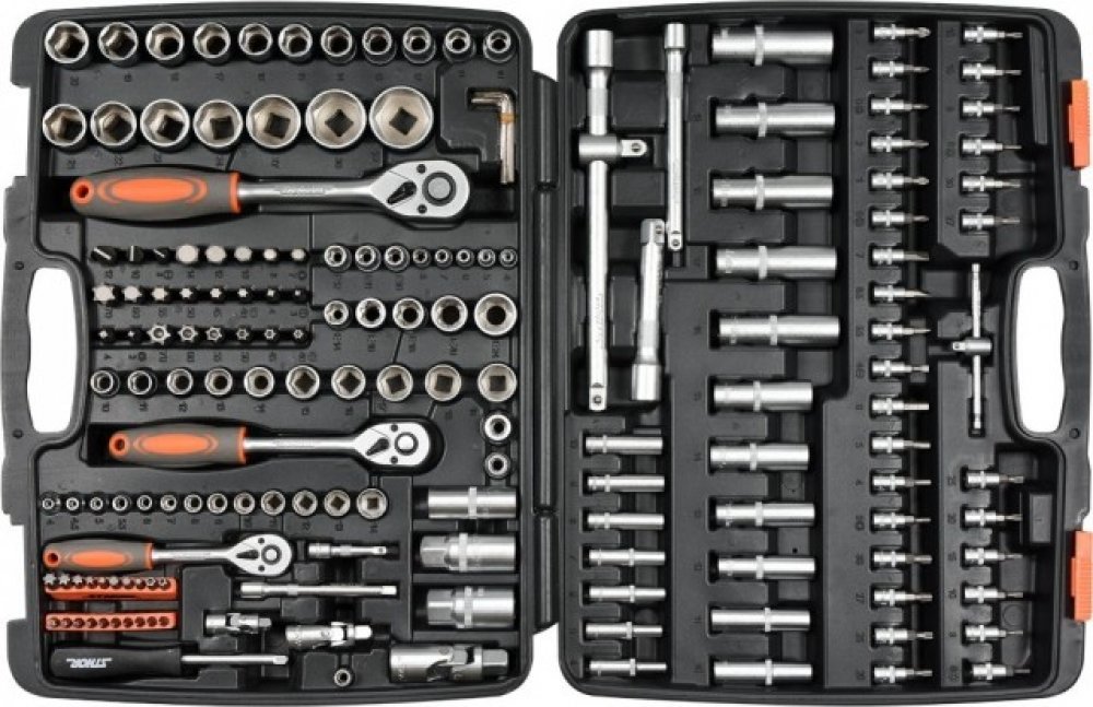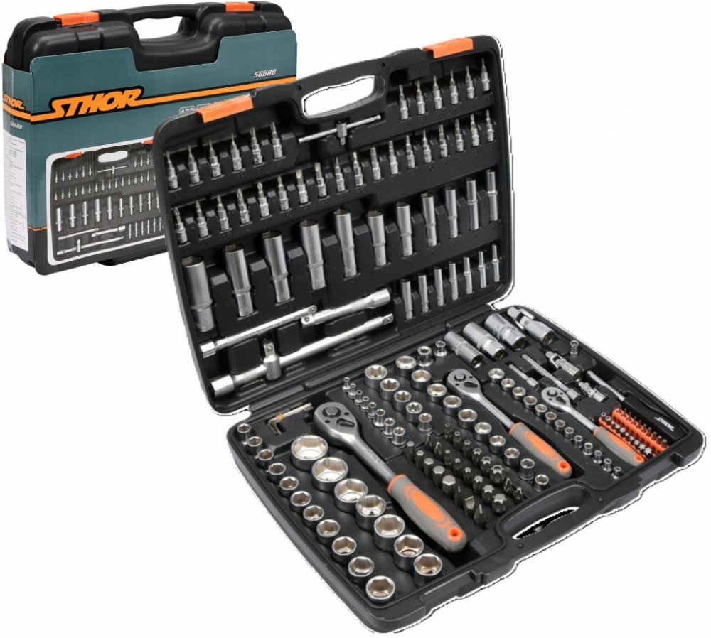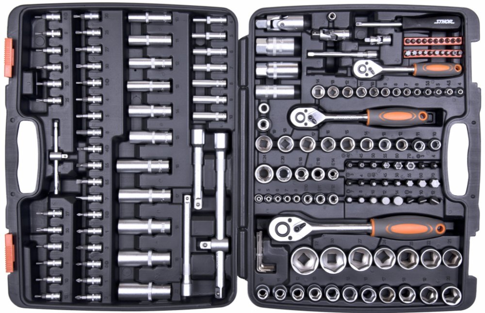 Sada Gola renomované značky Sthor obsahuje 173 kusů nářadí. V praktickém kufříku z odolného plastu tak najdete nejen ráčny ve třech velikostech, ale i nástrčné klíče. V setu mají své místo hlavice o průměru 1/2, 3/8 a 1/4 " a bity různých tvarů a velikostí (včetně šroubováku). Všechny kovové díly této sady jsou vyrobeny z vysoce kvalitní nástrojové oceli. Ráčny mají ergonomické rukojetis protisklu...