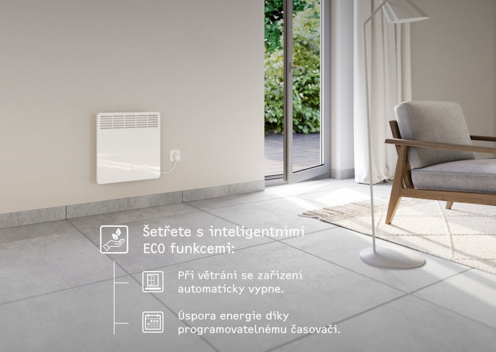 týdenní časovač, ochrana před mrazem a zjištění otevřeného okna, podtrhují účinnost a kvalitní vybavení nástěnného konvektoru.