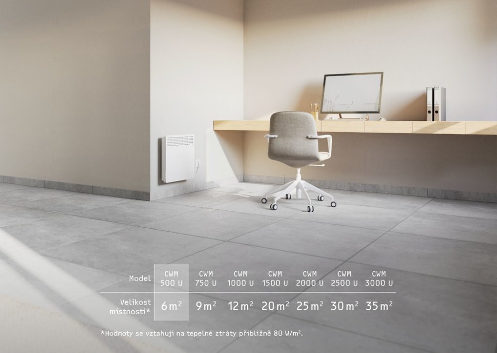 Nástěnný konvektor CWM 500 U s elektronickým termostatem zajistí rovnoměrné a tiché vytápění vaší místnosti. Díky kompaktním rozměrům je ideální pro montáž na stěnu, kde funguje jako nenápadný, ale účinný zdroj tepla – vhodný pro doplňkové i přechodné vytápění. Přehledný ovládací panel s podsvíceným LCD displejem umožňuje snadné nastavení všech funkcí. Pomocí týdenního časovače můžete naprogramovat teplotu podle svých potřeb. Konvektor je vybaven ochranou proti přehřátí, funkcí proti zamrznutí i hlavním vypínačem. Díky detekci otevřeného okna a adaptivní regulaci se přístroj automaticky přizpůsobí podmínkám a optimalizuje dobu předehřívání pro maximální úsporu energie i komfortní teplotu.