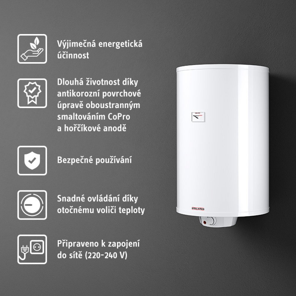 Příkon nástěnného zásobníku činí pouze 1,8 kW. Univerzální nástěnný držák umožňuje rychlou a snadnou nástěnnou montáž. Kvalitní magnéziová anoda chrání nádrž před korozí. Automatická ochrana před mrazem navíc kontroluje teplotu vody a chrání nádrž před zamrznutím.