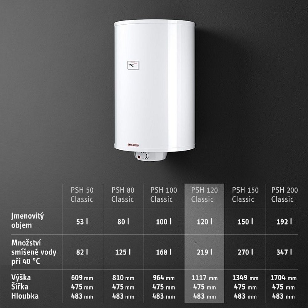 Nástěnné zásobníky PSH Classic jsou vhodné pro zásobování několika odběrných míst, např. současné zásobování koupelny a kuchyně. Nástěnné zásobníky umožňují plynulé nastavení teploty od 7 do 70 °C. Ukazatel ohřevu signalizuje režim ohřevu. Na ukazateli průběhu teploty na přední straně vnějšího pláště lze pohodlně sledovat aktuální teplotu vody.