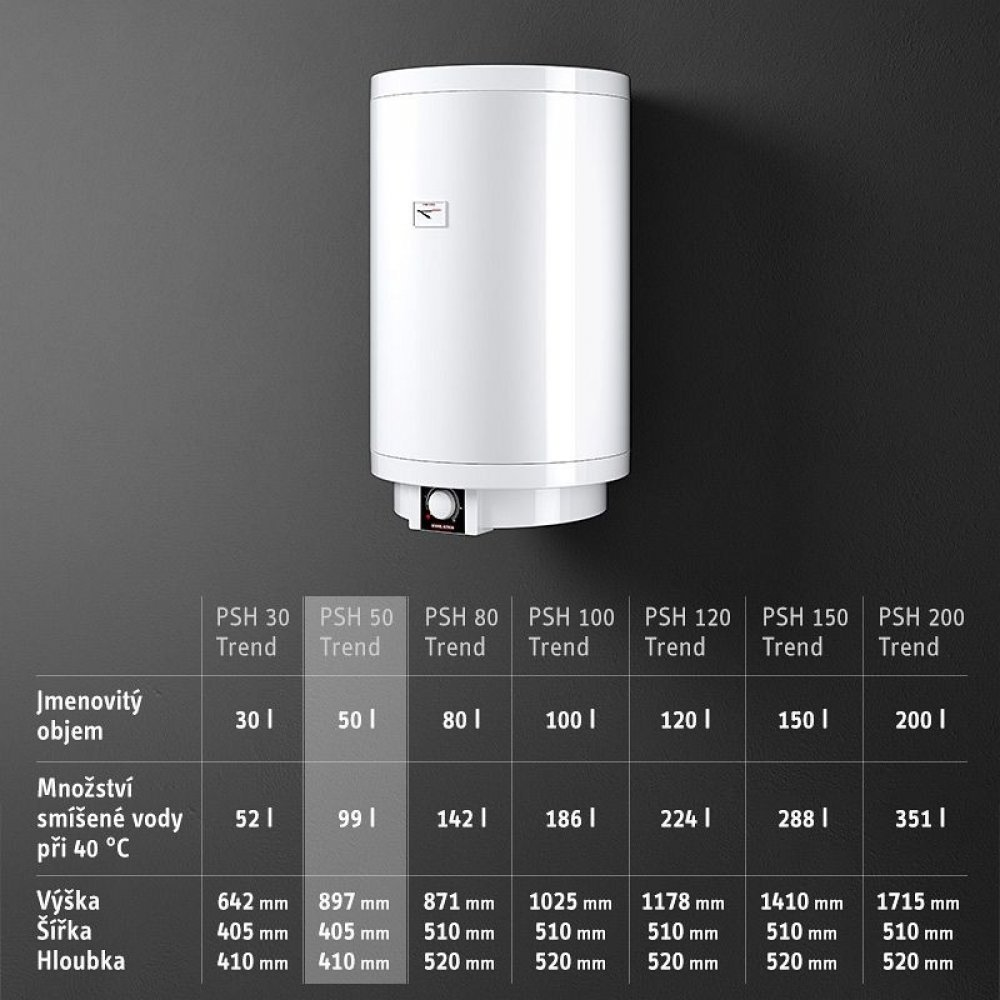 Přístroj PSH Trend je tlakový a mimořádně energeticky úsporný elektrický zásobník teplé vody s novým designem k zásobování jednoho nebo několika odběrných míst. Umožňuje plynulé nastavení teploty 35 °C až 75 °C a automaticky ohřívá při poklesu hodnot pod nastavenou teplotu. Ocelová vnitřní nádoba je opatřena zvláštním smaltem CoPro a ochrannou anodou, které společně zajišťují mimořádně dlouhou životnost. Výrobek je vhodný k provozu pouze formou tlakového zařízení s odpovídající bezpečnostní skupinou. Snadná montáž je zajištěna univerzálním nástěnným závěsem.