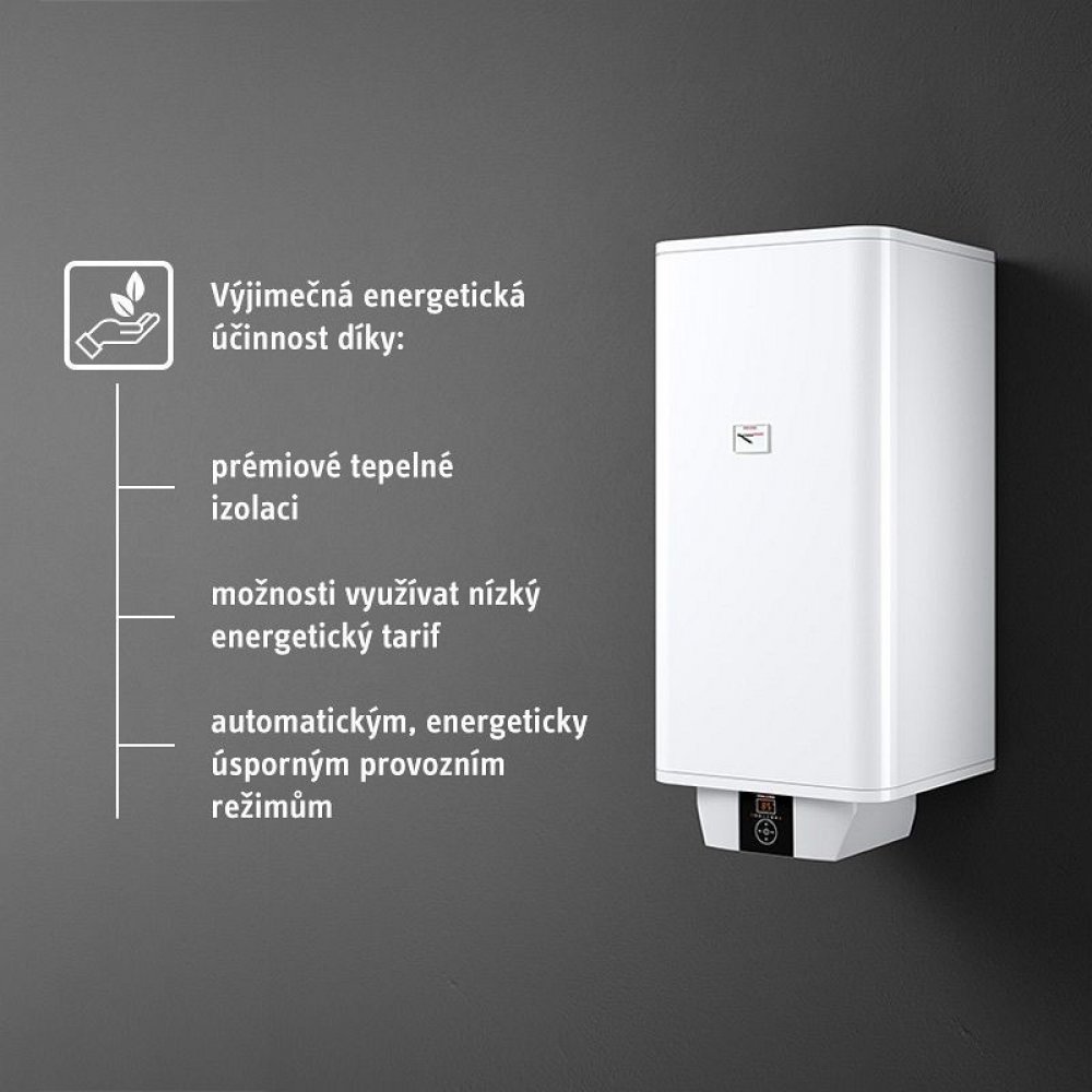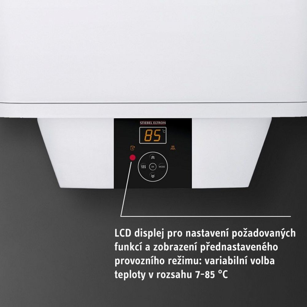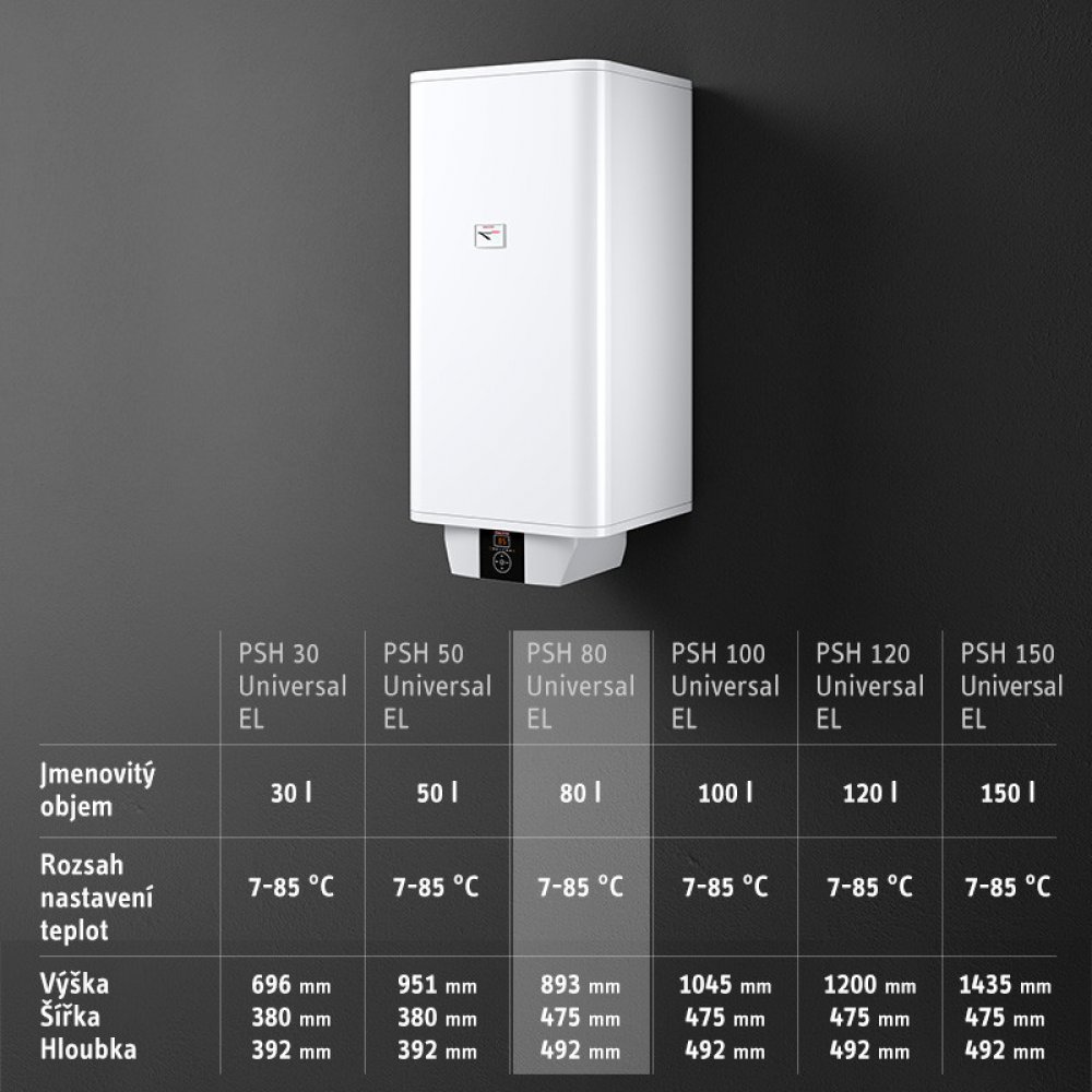 STIEBEL ELTRON PSH 80 UNIVERSAL EL zásobník vody 80 litrů, nástěnnýTECHNICKÉ PARAMETRY:Šířka: 475 mmHloubka: 492 mmVýška: 893 mmHmotnost: 34 kgJmenovitý objem: 80 litrůVÝKONOVÉ PARAMETRY:Příkon: 3 kWKmitočet: 50/60 HzPohotovostní spotřeba energie/24 hod. při 65 C vertikální: 0,79 kWhPohotovostní spotřeba energie/24 hod. při 65 C horizontální: 1,07 kWhDruh krytí (IP) horizontální: IP24Druh krytí (IP) vertikální: IP25Max. dovolený tlak: 0,60 MPa- funkce ECO- inteligentní, samoučící elektronika- svislá a horizontální instalace- plynulé nastavení teploty- funkce rychloohřevu- volící přepínač provozních režimů (jednookruhové-dvouokruhový a bojler)- ochranná magnesiová anoda- pro uzavřený provoz- topné těleso z ušlechtilé oceliS inteligentní a uživatelsky orientovanou elektronikou, jakož i třístupňovou funkcí ECO nástěnné zásobníky PSH na celé čáře přesvědčují v oblasti teplovodního pohodlí a energetické účinnosti. V montáži jsou obzvláště flexibilní: mohou se montovat jak kolmo, tak vodorovně. Nástěnné zásobníky PSH zajišťují jako uzavřený systém zásobování teplou vodou pro jedno nebo více odběrových míst. Nastavení teploty se provádí plynule od 7 C do 85 C. Přístroj navíc disponuje funkcemi: protimrazová ochrana, rychloohřev a omezení teploty. Ocelová vnitřní nádrž je vybavena speciálním smaltováním Copra a ochrannou anodou, čímž je zajištěna obzvlášť dlouhou životnost.
