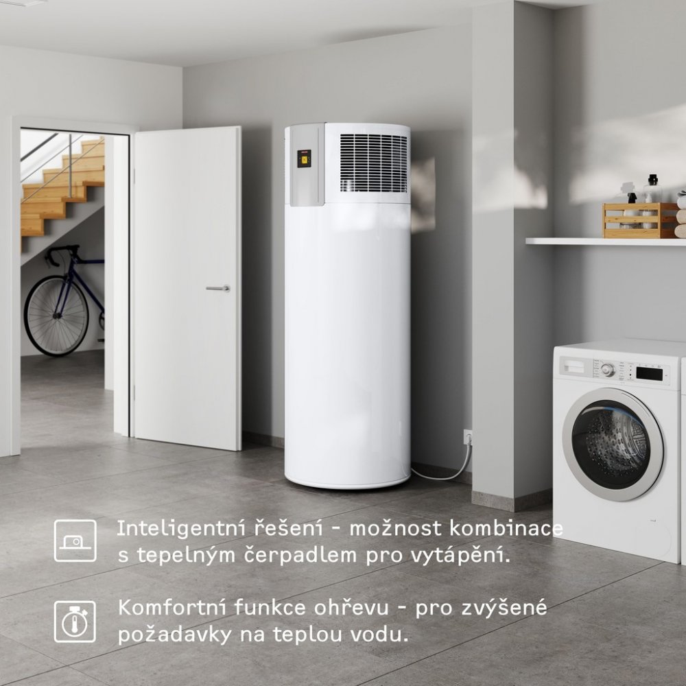 Komfort • Velmi vysoký komfort teplé vody je zajištěn náročnými odběrnými profily. • Pro efektivní a hygienickou přípravu teplé vody se dosahuje vysokých teplot již při čistém provozu tepelného čerpadla. • Pohodlná obsluha díky elektronickému regulátoru s LCD displejem, který pohodlně zobrazuje aktuální stav dostupného množství smíšené vody. • Velmi tichý provoz zajišťuje kompresor zvukově izolovaný od proudu vzduchu. • Integrovaná aktivní anoda s externím napájením snižuje náklady a zvyšuje bezpečnost. Odpružený tepelný výměník Rollbond zajišťuje bezpečnost a efektivní provoz po celou životnost přístroje.