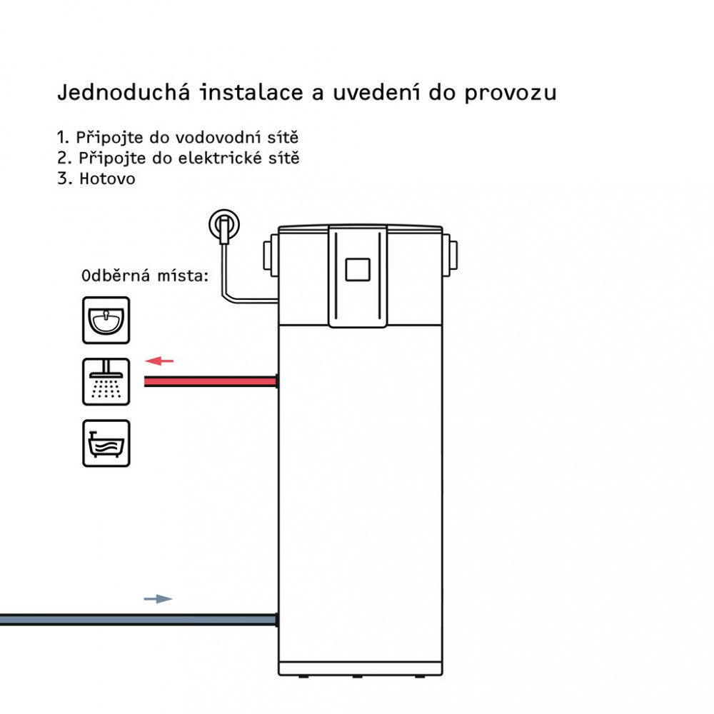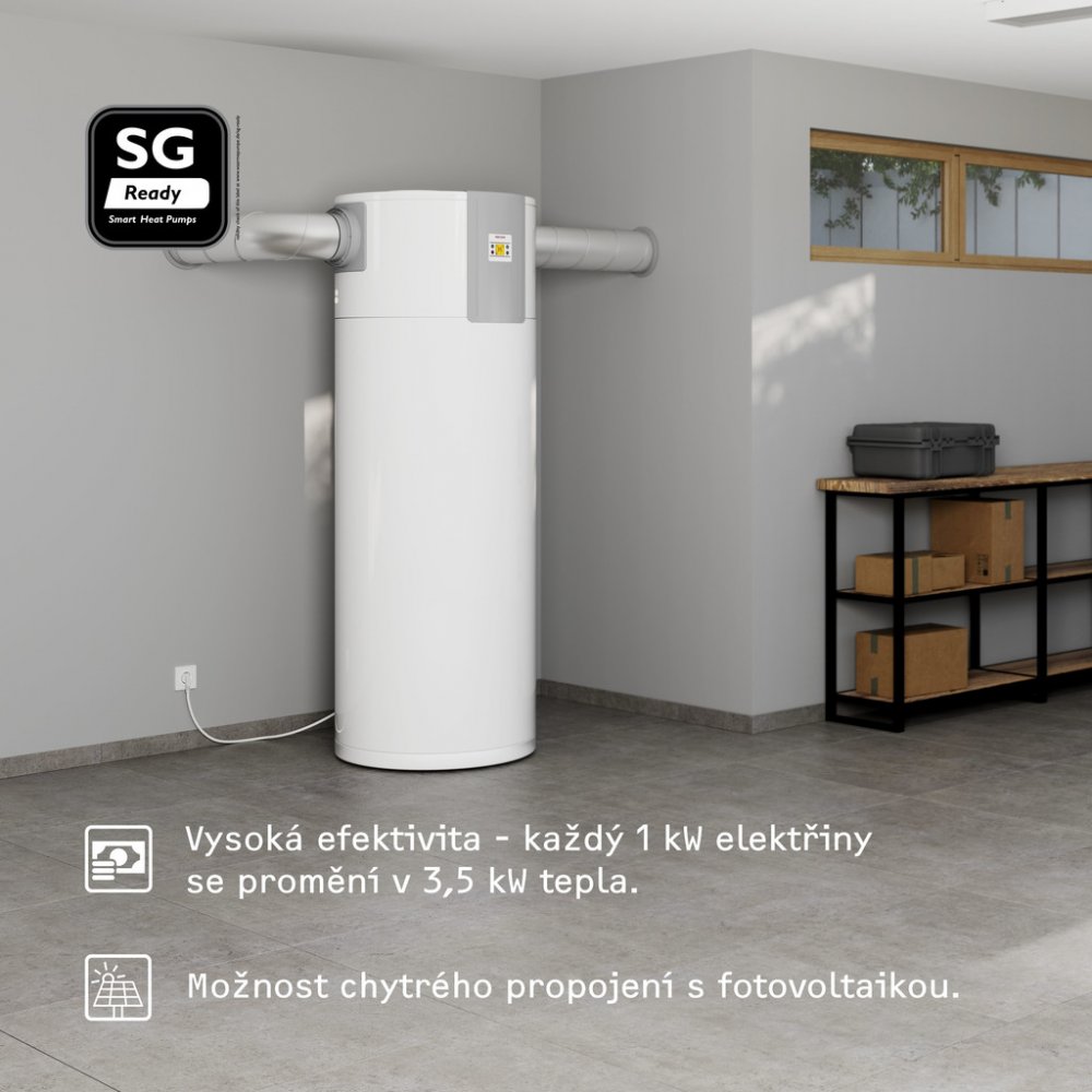 Komfortní charakteristiky • Náročné odběrné profily zajišťují velmi vysoký komfort teplé vody. V čistém provozu tepelného čerpadla jsou možné vysoké teploty a tím efektivní hygienická příprava teplé vody. • Vysoký komfort obsluhy. Elektronický regulátor je vybaven LCD displejem, který zobrazuje aktuálně dostupné množství smíšené vody. • Tichý provoz díky kompresoru zvukově izolovanému od proudu vzduchu. • Bezpečnost a úspora nákladů díky z výroby integrované aktivní anodě s externím napájením.