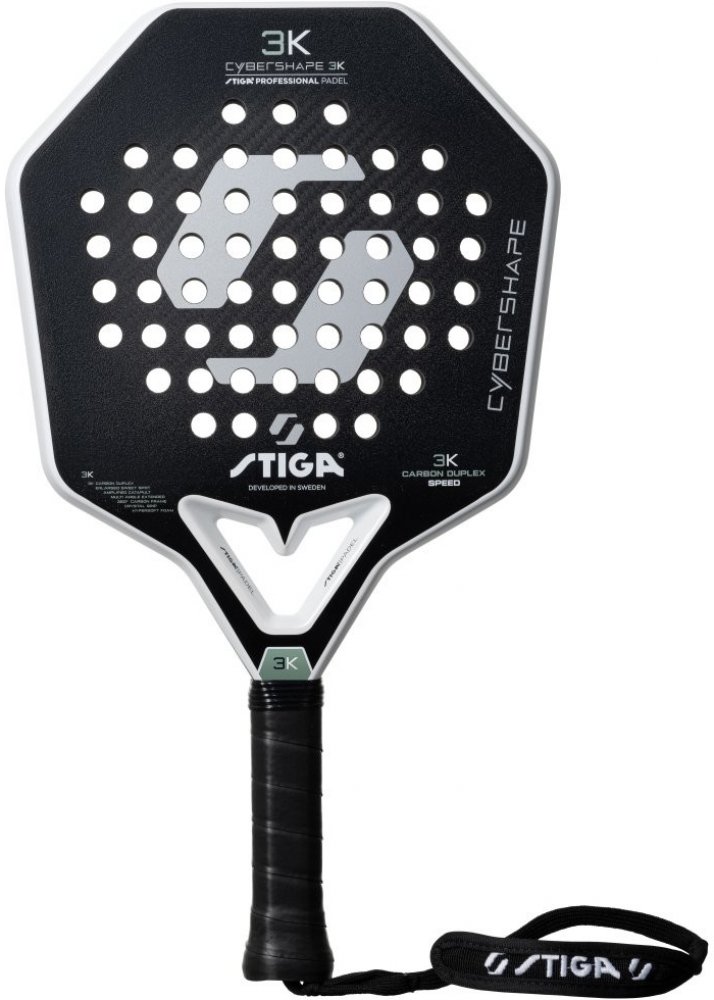 Stiga 3K CYBERSHAPE – maximální kontrola, síla a jedinečný cit ve hře. Poznejte rozdíl hned při prvním úderu. Cybershape 3K vám přináší mimořádně čistý a razantní pocit při kontaktu s míčkem. Díky středně vysokému vyvážení poskytuje ideální kombinaci rychlosti a kontroly – ať už hrajete agresivně nebo chytře obranně s cílem převzít iniciativu. Jedinečný šestiúhelníkový tvar Cybershape nabízí až o 20 % větší sweet spot, posunutý výše a dál od držadla než u klasických kulatých raket. Díky tomu získáte lepší odezvu i u úderů mimo střed. Rovné hrany usnadňují přesné zásahy blízko skla i nízko nad zemí. 360° Carbon Frame – extrémně pevný rám ze 100% uhlíkových vláken – zajišťuje výjimečnou stabilitu i při tvrdých úderech soupeře. Povrch rakety tvoří tkané 3K karbonové vlákno, které zvyšuje citlivost a zrychlení rakety. Strukturovaný Crystal Grip povrch podporuje maximální rotaci a přesnost. Prodloužený grip umožňuje komfortní obouruční držení a variabilitu ve hře. Součástí je i odnímatelné poutko na zápěstí, které lze snadno vyměnit.