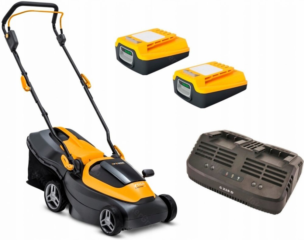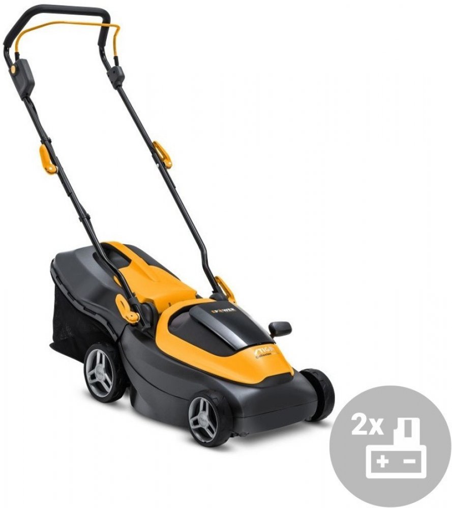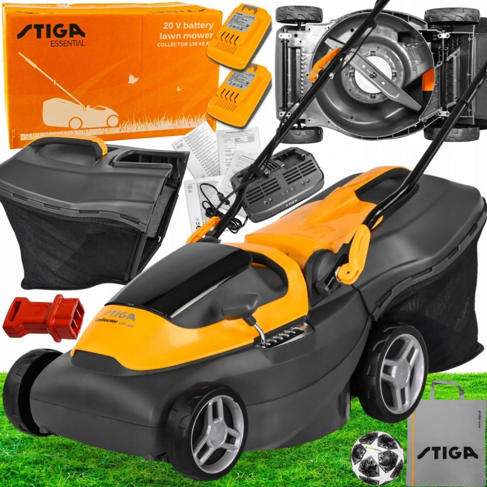 Stiga 550 W 34 cm 87 dB plast 11.75 kg bez pojezdu akumulátorové rotační 35 l 250 m2 550 W 20 V 2 Ah s elektromotorem 75 mm 6 plast a textil 126.7 x 45 x 116.7 cm 6