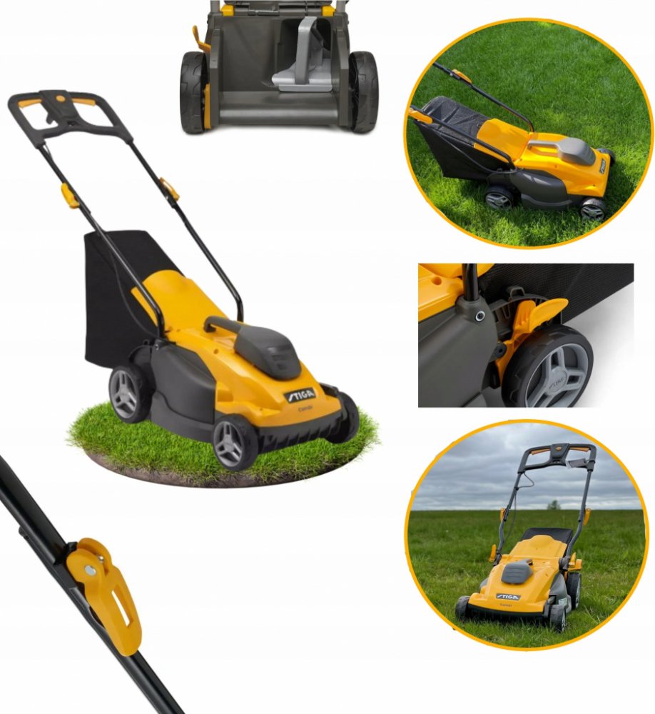 Stiga 1400 W 34 cm 92 dB plast 11 kg bez pojezdu elektrické rotační 35 l 400 m2 1400 W s elektromotorem 3400 ot/min 75 mm 3 textil 130 x 41 x 97 cm 6