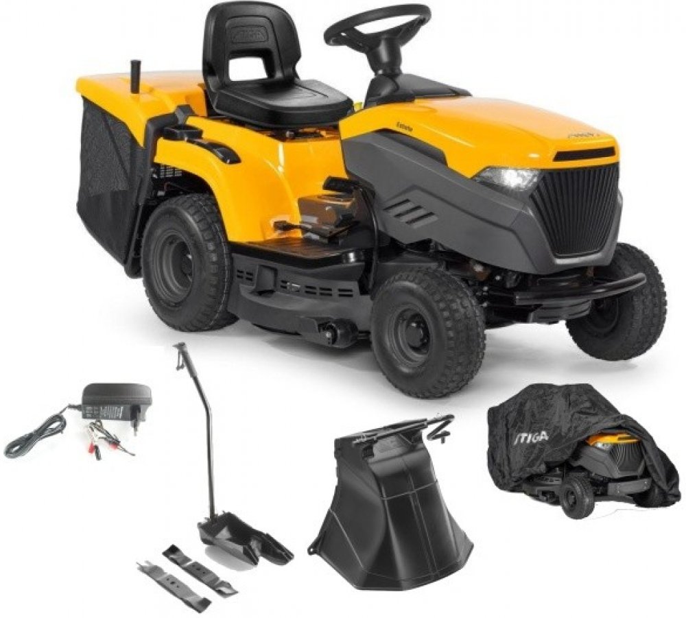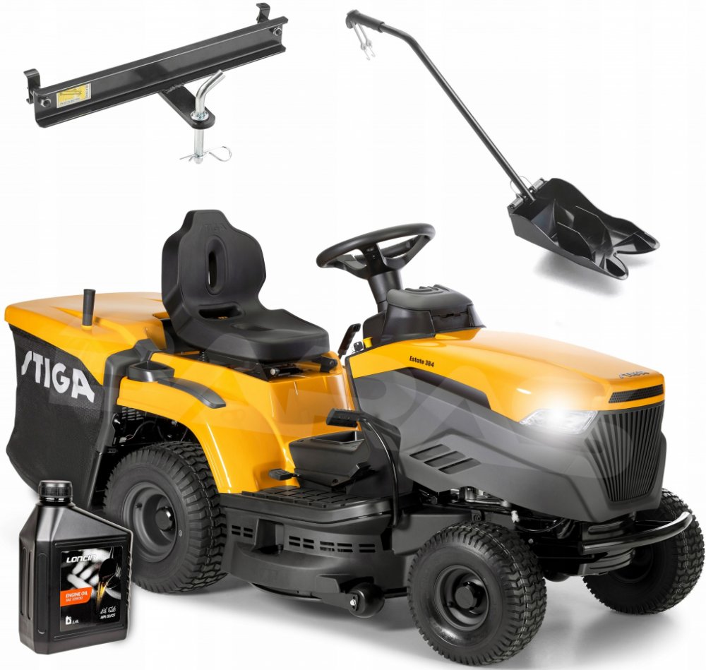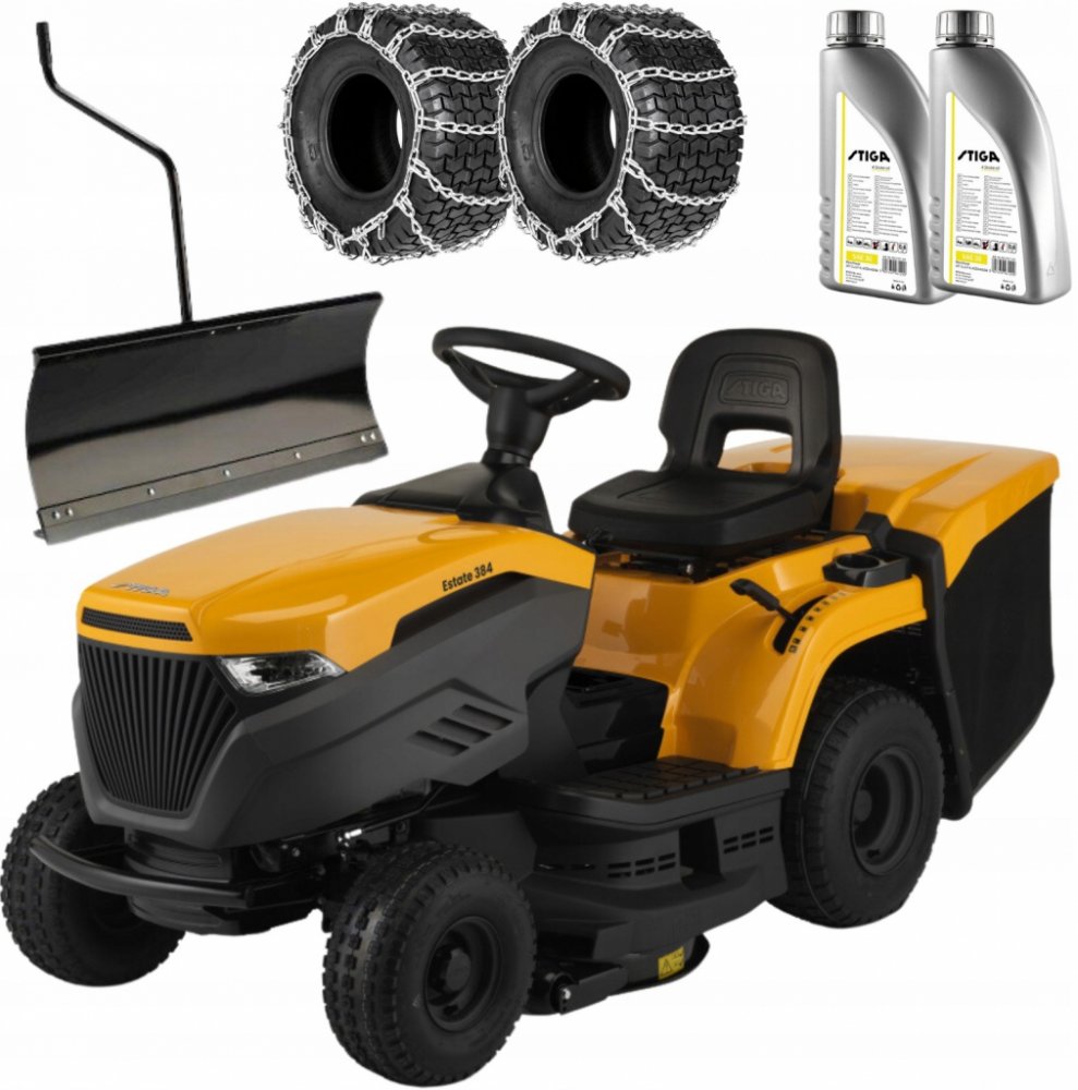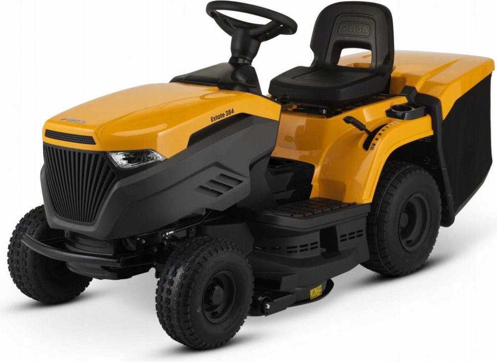 STIGA Estate 384 je vybavena benzínovým motorem STIGA s čistým výkonem 6,8 kW při 2 400 ot/min. Stroj je vybaven hydrostatickou převodovkou ovládanou pedálem, která umožňuje měnit rychlost jízdy bez nutnosti změny převodu. Žací ústrojí o šířce 84 cm má dva nože a 7 poloh nastavení výšky střihu od 25 do 80 mm. Dále je vybaven praktickým systémem elektromagnetické spojky nože, který je ovládán tlačí...