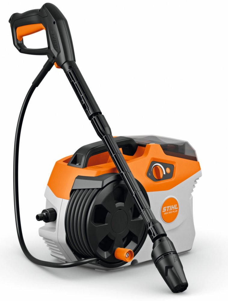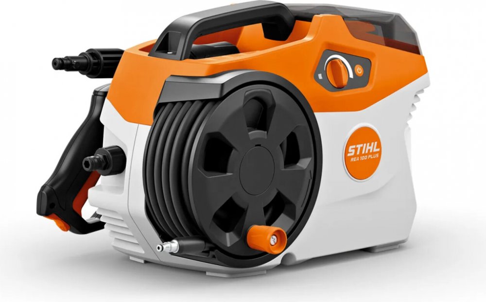 Tichý a výkonný EC motor STIHL REA 100 PLUS v kombinaci s robustním vysokotlakým čerpadlem a hliníkovou hlavou čerpadla umožňuje maximální tlak až 150 barů a podporuje rychlý postup práce. Pro efektivní čištění různých povrchů má STIHL REA 100 PLUS plynulou regulaci tlaku a je vybavena tryskou 3 v 1 na trysce. Jednoduchým otočením si můžete vybrat rotorovou trysku, trysku s plochým paprskem nebo trysku na čisticí prostředek. Jednotlivé trysky není potřeba dále skládat a demontovat. Rychlospojka vysokotlaké pistole odolná proti odvrtání zajišťuje, že se vysokotlaká hadice během čištění nezkroutí. STIHL REA 100 PLUS je dále vybavena integrovaným navijákem hadice s vedením hadice, který umožňuje pohodlnou manipulaci a prostorově úsporné skladování 6 m dlouhé vysokotlaké hadice. Integrované držáky pro vysokotlakou pistoli a trysku usnadňují přepravu a skladování.