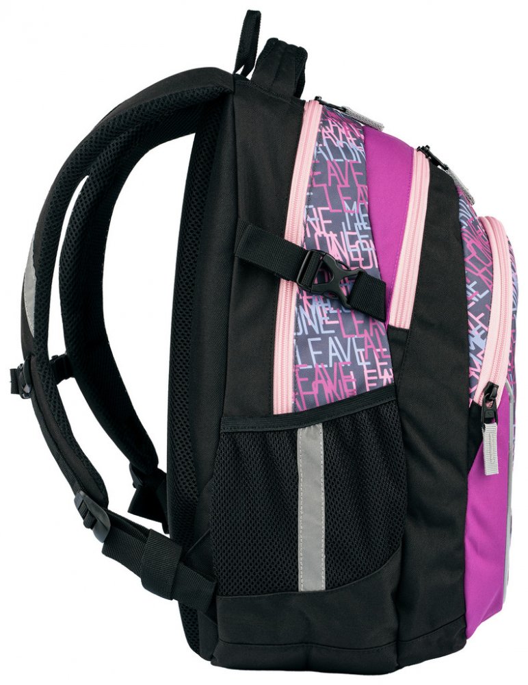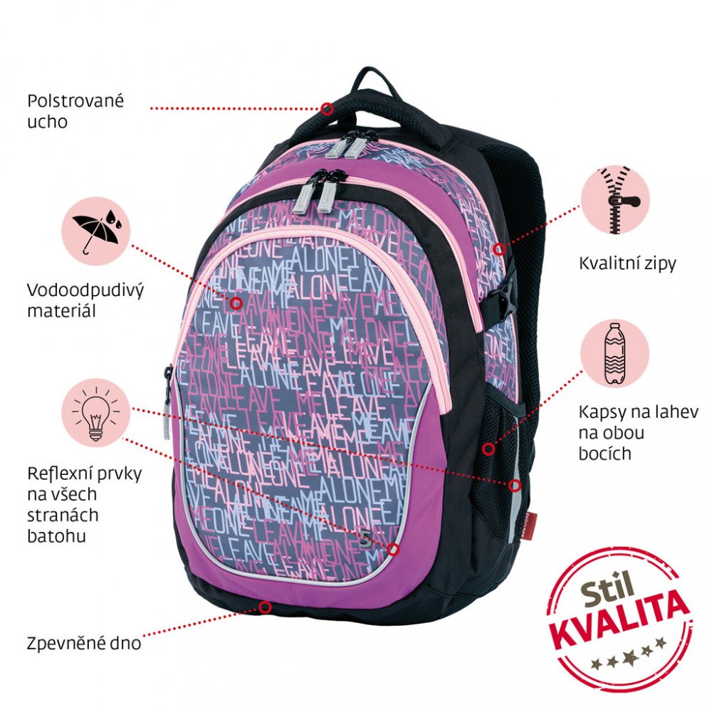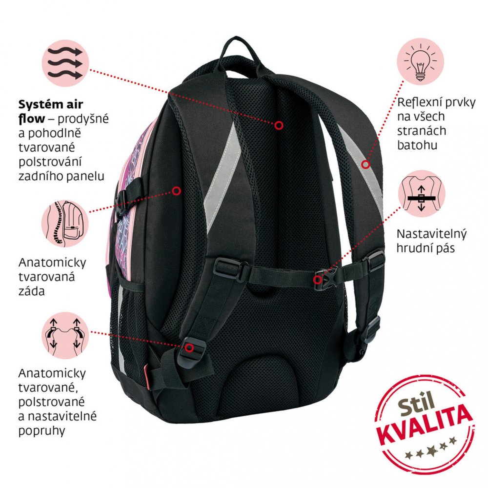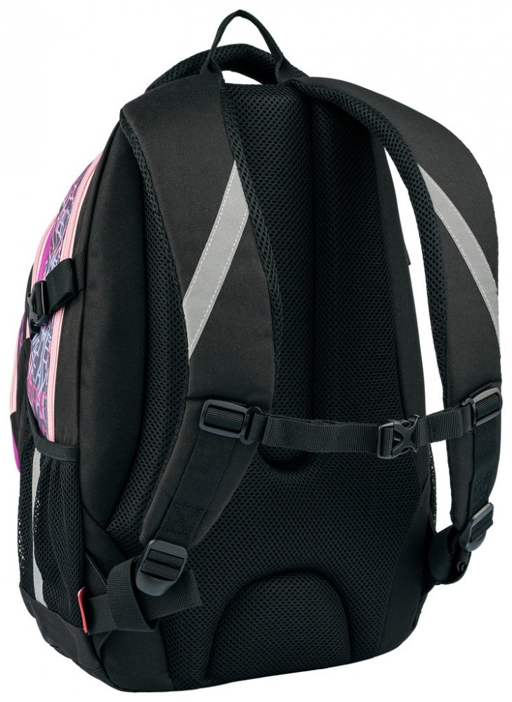 Kvalitní, ergonomicky tvarovaný odlehčený studentský batoh s 3D zádovým systémem. Polstrování je z prodyšného materiálu. Na bocích batohu jsou kapsy na láhev na pití. Skládá se ze 3 komor.