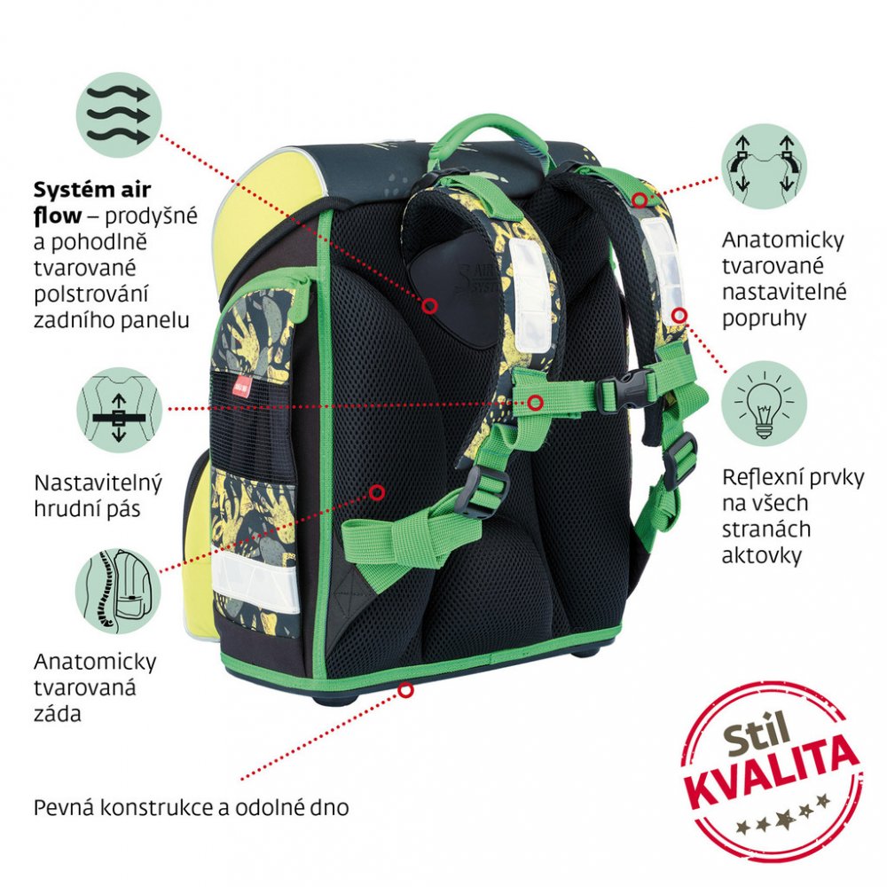 BEZPEČNOST - bezpečnostní prvky jsou velmi důležité, proto je aktovka vybavena reflexní pásky na všech stranách batohu, které zaručí lepší viditelnost a bezpečnost dítěte ve tmě.