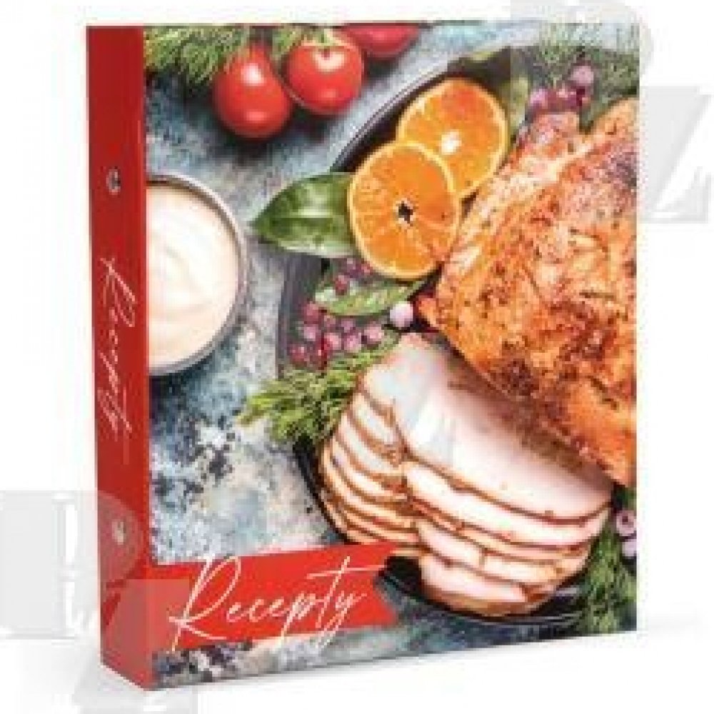 Kniha na recepty A5 je ozdobenárůznými pokrmy apro svůjmenší formát je dobře skladná.
