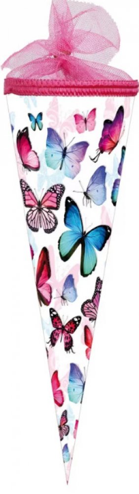 Papírový školní kornouty kulatý o výšce 50 cm s tylovým lemem.